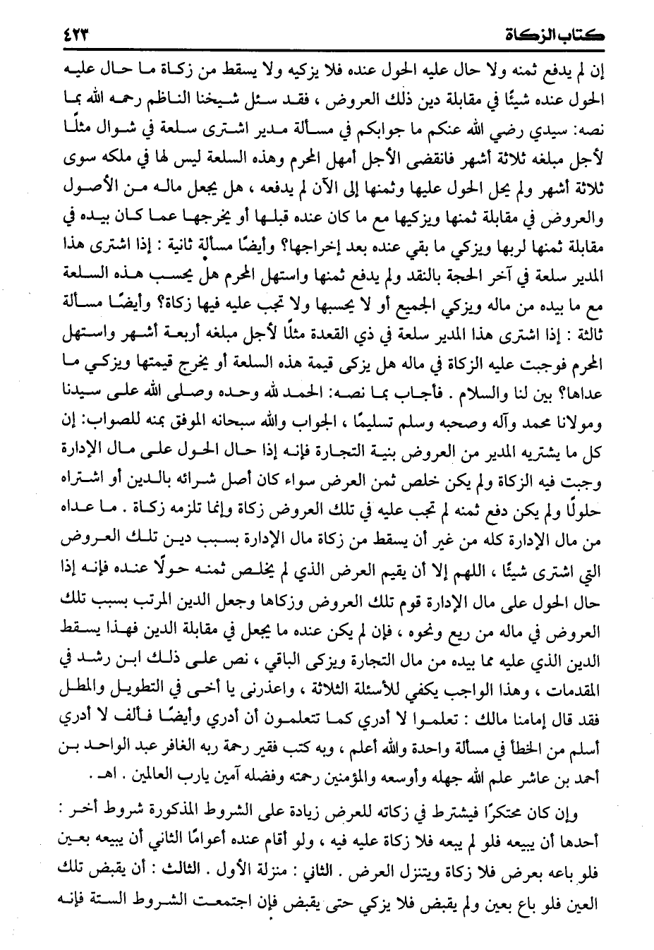 إن كل مايشتريه المدير من العروض بنية التجارة فإنه إذا حال الحول على مال الادارة وجبت فيه الزكاة ولم يكن خلص ثمن العرض سواء كان أصل شرائه بالدين أو اشتراه حلولا ولم يكن دفع ثمنه لم تجب عليه في تلك العروض زكاة وإنما تلزمه زكاة ماعداه من مال الادارة كله من غير أن يسقط من زكاة مال الادارة بسبب دين تلك العروض التي اشترى شيئاً اللهم إلا أن يقيم العرض الذي لم يخلص ثمنه حولا عنده فانه إذا حال الحول على مال الادارة قوم تلك العروض وزكاها وجعل الدين المرتب بسبب تلك العروض في ماله من ريع ونحوه فان لم يكن عنده مايجعل في مقابلة الدين فهذا يسقط الدين الذي عليه مما بيده من مال التجارة ويزكى الباقي نص على ذلك ابن رشد وهذا الواجب يكفي للأسئلة الثلاثة واعذرنى ياأخى في التطويل والمطل فقد قال إمامنا مالك تعلموا (لا أدري) كما تتعلموا أن أدري وأيضاً فألف لا أدري أسلم من الخطأ في مسألة واحدة والله أعلم وبه كتب فقير رحمة ربه الغافر عبد الواحد بن احمد بن عاشر علم الله جهله وأوسعه والمؤمنين رحمته وفضلة آمين يارب العالمين اهـ وإن كان محتكراً فيشترط في زكاته للعرض زيادة على الشروط المذكورة شروط أخر أحدها أن يبيعه فلو لم يبعه فلا زكاة عليه فيه ولو أقام عنده أعواما