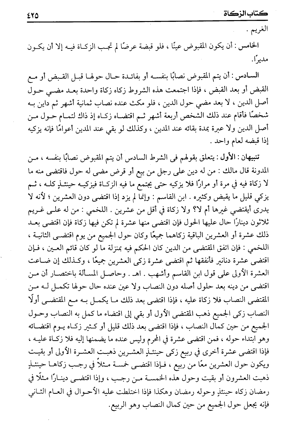 (تنبيهان) الأول يتعلق بقولهم فى الشرط السادس أن يتم المقبوض نصاباً بنفسه من المدونة قال مالك من له دين على رجل من بيع أو قرض مضى له حول فاقتضى منه ما لا زكاة فيه في مرة أو مراراً فلا يزكيه حتى يجتمع مافيه الزكاة فيزكيه حينئذ كله ثم يزكي قليل مايقبض وكثيره ابن القاسم وإنما لم يزد إذا اقتضى دون العشرين لأنه لايدرى أيقتضي غيرها أم لا ولا زكاة في أقل من عشرين اللخمي من له غريم ثلاثون له عليه ديناراً حال عليها الحول فان اقتضى منها عشرة لم تكن فيها زكاة فاقتضى بعد ذلك عشرة أو العشرين الباقية زكاهما جميعا وكان حول الجميع من يوم اقتضى الثانية اللخمي فان اتفق المقتضى من الدين كان الحكم فيه بمنزلة مالو كان قائم العين فان اقتضى عشرة دنانير فأنفقها ثم انقضى عشرة زكى العشرين جميعاً وكذلك إن ضاعت العشرة الأولى على قول ابن القاسم وأشهب اهـ