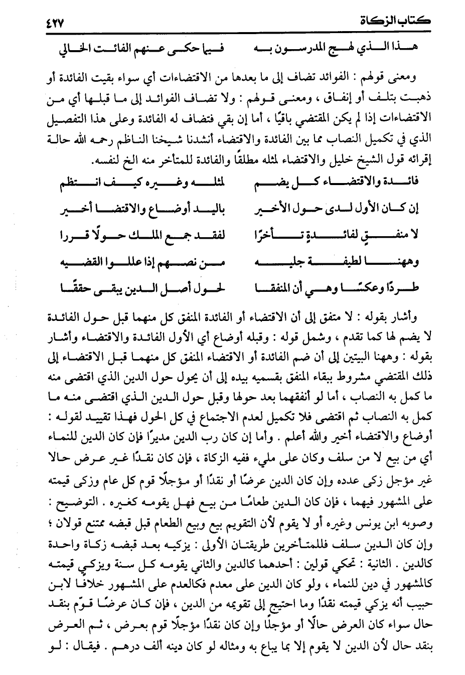 ومعنى قولهم الفوائد تضاف إلى مابعدها من الاقتضاءات أي سواء بقيت الفائدة أو ذهبت بتلف أو إنفاق ومعنى قولهم ولاتضاف الفوائد إلى ماقبلها أي من الاقتضاءات إذا لم يكن المقتضي باقيا أما إن بقي فتضاف له الفائدة وعلى هذا التفصيل الذي في تكميل النصاب مما بين الفائدة والاقتضاء أنشدنا شيخنا الناظم رحمه الله حالة إقرائه قول الشيخ خليل والاقتضاء لمثله مطلقا والفائدة للمتأخر منه الخ لنفسه.
