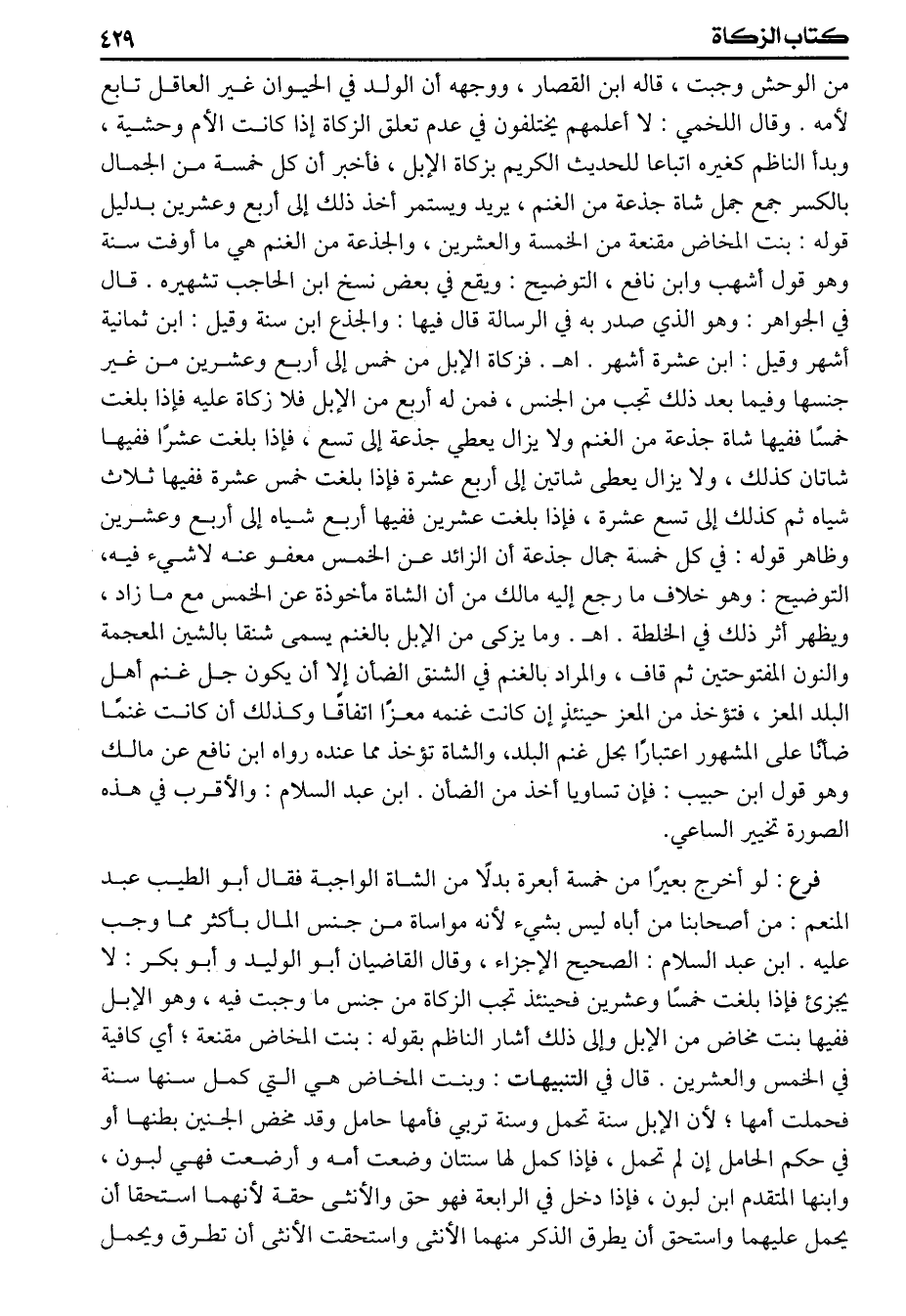 (فرع) لو أخرج بعيراً من خمسة أبعرة بدلا من الشاة الواجبة فقال أبو الطيب عبد المنعم من أصحابنا من أباه ليس بشيء لأنه مواساة من جنس المال بأكثر مما وجب عليه ابن عبد السلام الصحيح الاجزاء وقال القاضيان أبو الوليد وأبو بكر لايجزيء فاذا بلغت خمسا وعشرين فحينئذ تجب الزكاة من جنس ماوجبت فيه وهو الابلى ففيها بنت مخاض من الابل وإلى ذلك أشار الناظم بقوله بنت المخاض مقنعة أي كافية في الخمس والعشرين قال في التنبيهات وبنت المخاض هي التي كمل سنها سنة فحملت أمها لأن الابل سنة تحمل وسنة تربي فأمها حامل وقد مخض الجنين بطنها أو فيحكم الحامل إن لم تحمل فإذا كمل لها سنتان وضعت أمه وأرضعت فهي لبون وابنها المتقدم ابن لبون فاذا دخل في الرابعة فهو حق والأنثى حقة لأنهما استحقا أن يحمل عليهما واستحق أن يطرق الذكر منهما الأنثى واستحقت الأنثى أن تطرق ويحمل