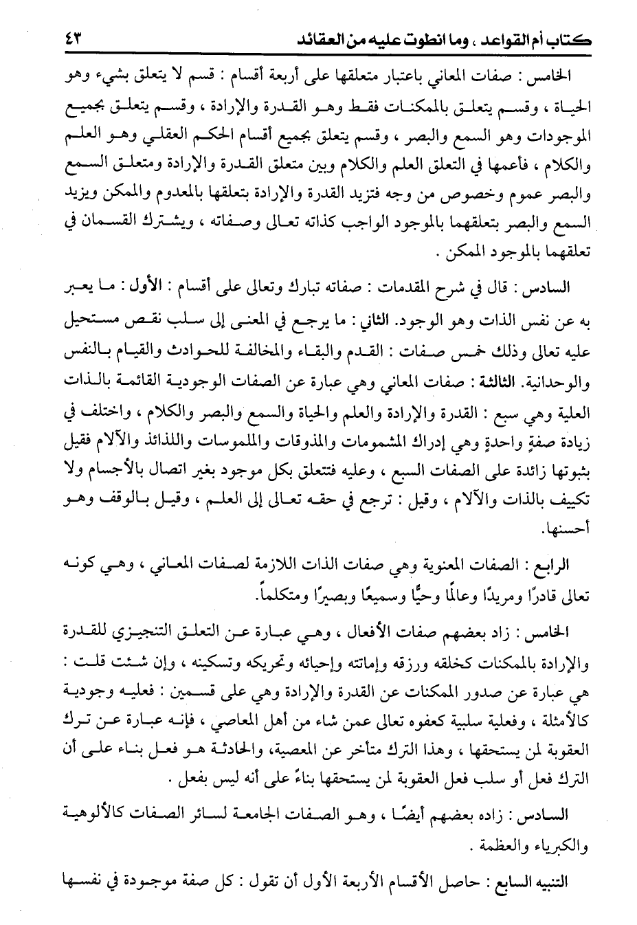 (الخامس) صفات المعاني باعتبار متعلقها على أربعة أقسام قسم لايتعلق بشيء وهو الحياة وقسم يتعلق بالممكنات فقط وهو القدرة والإرادة وقسم يتعلق بجميع الموجودات وهو السمع والبصر وقسم يتعلق بجميع أقسام الحكم العقلي وهو العلم والكلام فأعمها في التعلق العلم والكلام وبين متعلق القدرة والإرادة ومتعلق السمع والبصر عموم وخصوص من وجه فتزيد القدرة والإرادة بتعلقها بالمعدوم والممكن. ويزيد السمع والبصر بتعلقهما بالموجود الواجب كذاته تعالى وصفاته ويشترك القسمان في تعلقهما بالموجود الممكن (السادس) قال في شرح المقدمات صفاته تبارك وتعالى على أقسام. الأول مايعبربه عن نفس الذات وهو الوجود. الثاني مايرجع في المعنى إلى سلب نقص مستحيل عليه تعالى وذلك خمس صفات القدم والبقاء والمخالفة للحوادث والقيام بالنفس والوحدانية. الثالثة صفات المعاني وهي عبارة عن الصفات الوجودية القائمة بالذات العلياوهي سبع القدرة والإرادة والعلم والحياة والسمع والبصر والكلام واختلف في زيادة صفةٍ واحدةٍ وهي إدراك المشمومات والمذوقات والملموسات واللذائذ والآلام فقيل بثبوتها زائدة على الصفات السبع وعليه فتتعلق بكل موجود بغير اتصال بالأجسام ولا تكييف بالذات والآلام وقيل ترجع في حقه تعالى إلى العلم وقيل بالوقف وهوأحسنها. الرابع الصفات المعنوية وهي صفات الذات اللازمة لصفات المعاني وهي كونه تعالى قادراً ومريداً وعالماً وحياً وسميعاً وبصيراً ومتكلماً. الخامس زاد بعضهم صفات الأفعال وهي عبارة عن التعلق التنجيزي للقدرة والإرادة بالممكنات كخلقه ورزقه وإماتته وإحيائه وتحريكه وتسكينه وإن شئت قلت هي عبارة عن صدور الممكنات عن القدرة والإرادة وهي على قسمين. فعليه وجودية كالأمثلة وفعلية سلبية كعفوه تعالى عمن شاء من أهل المعاصي فإنه عبارة عن ترك العقوبة لمن يستحقها وهذاالترك متأخر عن المعصية، والحادثة هوفعل بناء على أن الترك فعل أوسلب فعل العقوبة لمن يستحقها بناءً على أنه ليس بفعل. (السادس) زاده بعضهم أيضاً وهوالصفات الجامعة لسائر الصفات كالألوهية
