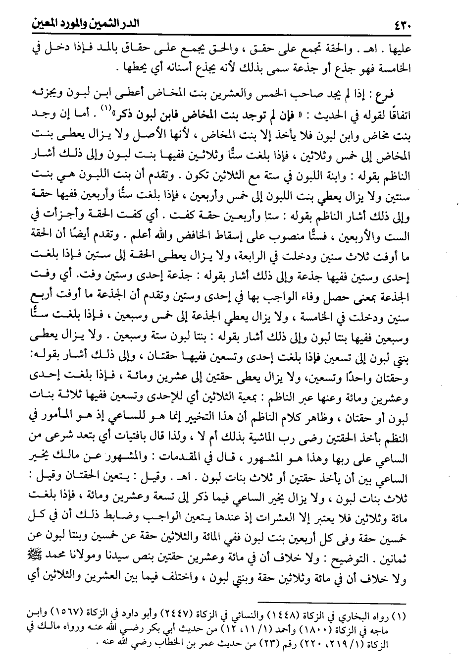 وتقدم أيضا أن الحقة ماأوفت ثلاث سنين ودخلت في الرابعة، ولايزال يعطى الحقة إلى ستين فاذا بلغت إحدى وستين ففيها جذعة وإلى ذلك أشار بقوله (جذعة إحدى وستين وفت) أي وفت الجذعة بمعنى حصل وفاء الواجب بها في إحدى وستين وتقدم أن الجذعة ماأوفت أربع سنين ودخلت في الخامسة ولايزال يعطي الجذعة إلى خمس وسبعين فاذا بلغت ستا وسبعين ففيها بنتا لبون وإلى ذلك أشار بقوله (بنتا لبون ستة وسبعين) ولايزال يعطى بنتي لبون إلى تسعين فإذا بلغت إحدى وتسعين ففيها حقتان، لووعدم كمال ملكه من جهة أنه لايتصرف التصرف التام لا من جهة أن له انتزاع ماله إذ لايشمل المكاب ونحوه وإلى ذلك أشار بقوله: وحقتان واحداً وتسعين، ولا يزال يعطى حقتين إلى عشرين ومائة فإذا بلغت إحدى وعشرين ومائة وعنها عبر الناظم بمعية الثلاثين أي للإحدى وتسعين ففيها ثلاثة بنات لبون أو حقتان وظاهر كلام الناظم أن هذا التخيير إنما هو للساعي إذ هو المأمور في النظم بأخذ الحقتين رضى رب الماشية بذلك أم لا ولذا قال باقتيات أي بتعد شرعى من الساعي على ربها وهذا هو المشهور قال في المقدمات والمشهور عن مالك يخير الساعي بين أن يأخذ حقتين أو ثلاث بنات لبون اهـ وقيل يتعين الحقتان وقيل ثلاث بنات لبون ولايزال يخير الساعي فيما ذكر إلى تسعة وعشرين ومائة فاذا بلغت مائة وثلاثين فلا يعتبر إلا العشرات إذ عندها يتعين الواجب وضابط ذلك أن في كل خمسين حقة وفى كل أربعين بنت لبون ففي المائة والثلاثين حقة عن خمسين وبنتا لبون عن ثمانين التوضيح ولاخلاف أن في مائة وعشرين حقتين بنص سيدنا ومولانا محمد ولا خلاف أن فيى مائة وثلاثين حقة وبنتي لبون واختلف فيما بين العشرين والثلاثين أي
