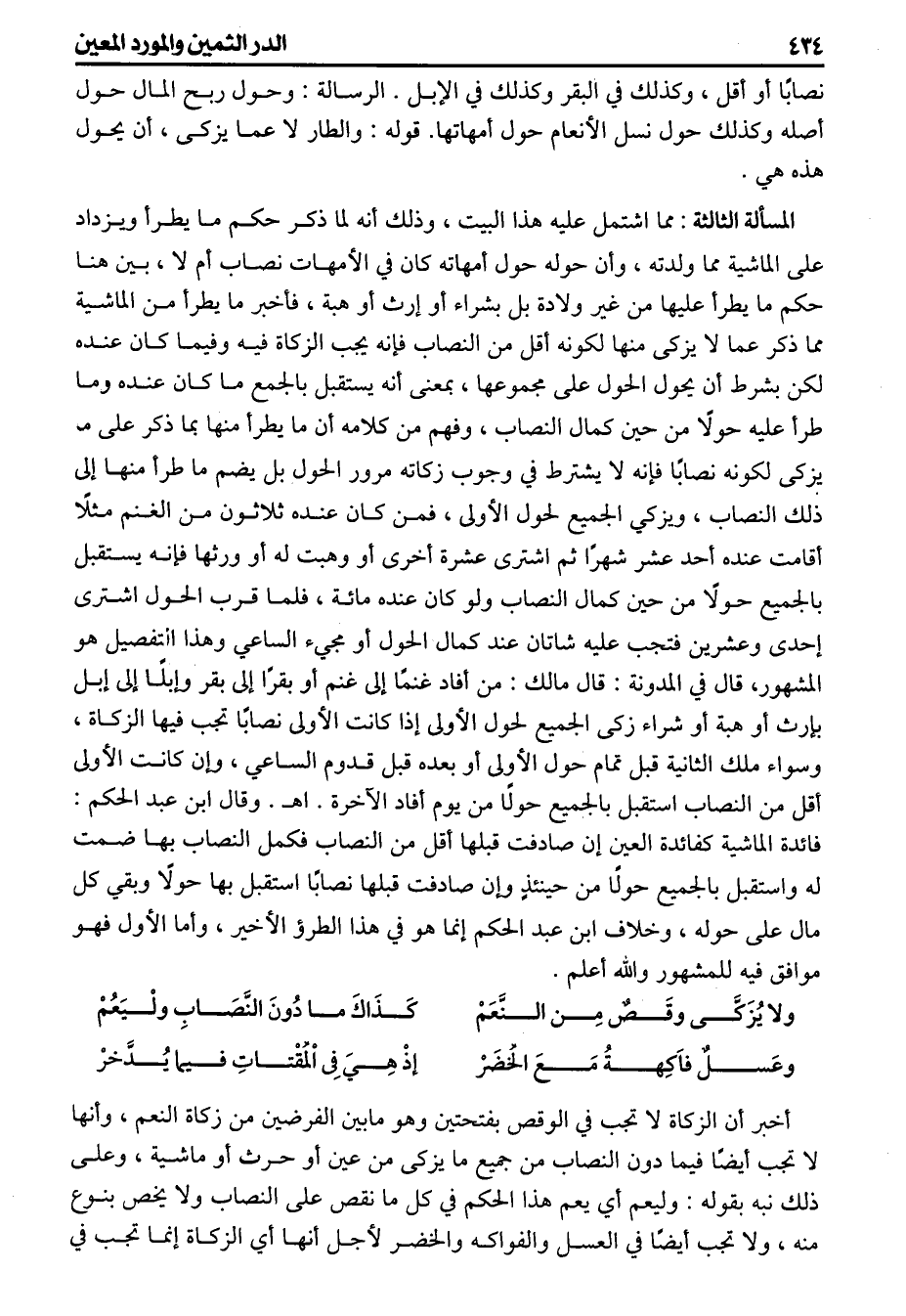 نصابا أو أقل وكذلك في البقر وكذلك في الإبل الرسالة وحول ربح المال حول أصله وكذلك حول نسل الأنعام حول أمهاتها. لووعدم كمال ملكه من جهة أنه لايتصرف التصرف التام لا من جهة أن له انتزاع ماله إذ لايشمل المكاب ونحوه
