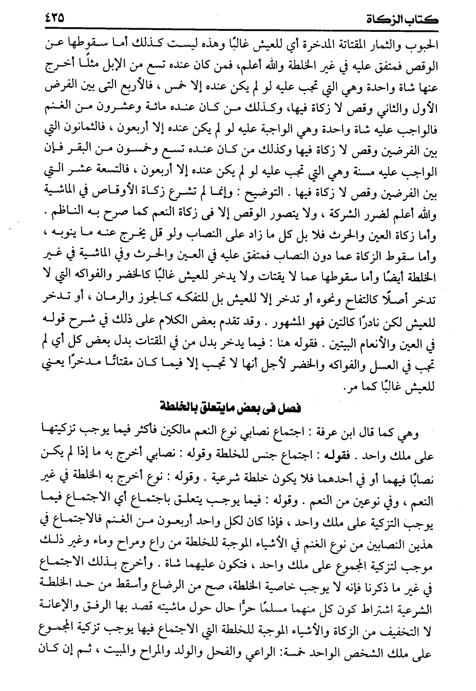 وهي كما قال ابن عرفة اجتماع نصابي نوع النعم مالكين فأكثر فيما يوجب تزكيتها على ملك واحد فقوله اجتماع جنس للخلطة وقوله نصابي أخرج به ماإذا لم يكن نصابا فيهما أو في أحدهما فلا يكون خلطة شرعية وقوله نوع أخرج به الخلطة في غير النعم وفي نوعين من النعم وقوله فيما يوجب يتعلق باجتماع أي الاجتماع فيما يوجب التزكية على ملك واحد فإذا كان لكل واحد أربعون من الغنم فالاجتماع في هذين النصابين من نوع الغنم في الأشياء الموجبة للخلطة من راع ومراح وماء وغير ذلك موجب لتزكية المجموع على ملك واحد فتكون عليهما شاة وأخرج بذلك الاجتماع في غير ماذكرنا فإنه لايوجب خاصية الخلطة، صح من الرضاع وأسقط من حد الخلطة الشرعية اشتراط كون كل منهما مسلما حراً حال حول ماشيته قصد بها الرفق والإعانة لا التخفيف من الزكاة والأشياء الموجبة للخلطة التي الاجتماع فيها يوجب تزكية المجموعة على ملك الشخص الواحد خمسة: الراعي والفحل والولد والمراح والمبيت ثم إن كان