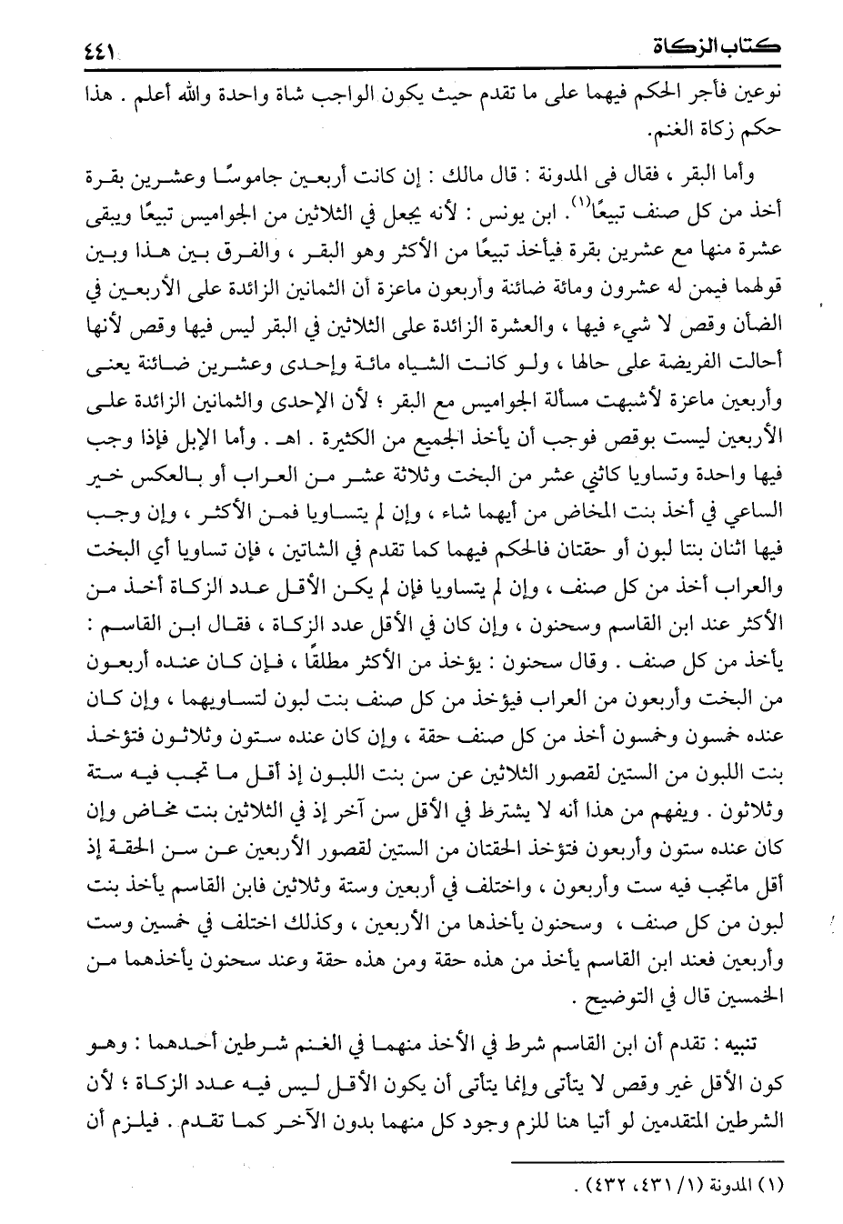 وأما البقر فقال فى المدونة قال مالك إن كانت أربعين جاموسا وعشرين بقرة أخذ من كل صنف تبيعا ابن يونس لأنه يجعل في الثلاثين من الجواميس تبيعا ويبقى عشرة منها عشرين بقرة فيأخذ تبيعا من الأكثر وهو البقر والفرق بين هذا وبين قولهما فيمن له عشرون ومائة ضائنة وأربعون ماعزة أن الثمانين الزائدة على الأربعين في الضائن وقص لاشيء فيها والعشرة الزائدة على الثلاثين في البقر ليس فيها وقص لأنها أحالت الفريضة على حالها ولو كانت الشاة مائة وإحدى وعشرين ضائنة يعنى وأربعين ماعزة لأشبهت مسألة الجواميس مع البقر لأن الأحد والثمانين الزائدة على الأربعين ليست بوقص فوجب أن يأخذ الجميع من الكثيرة وأما الإبل فإذا وجب فيها واحدة وتساويا كاثني عشر من البخت وثلاثة عشر من العراب أو بالعكس خير الساعى في أخذ بنت المخاض من أيهما شاء وإن لم يتساويا فمن الأكثر وإن وجب فيها اثنان بنتا لبون أو حقتان فالحكم فيهما كما تقدم في الشاتين فإن تساويا أي البخت والعراب أخذ من كل صنف، وإن لم يتساويا فإن لم يكن الأقل عدد الزكاة أخذ من الأكثر عند ابن القاسم وسحنون وإن كان في الأقل عدد الزكاة فقال ابن القاسم يأخذ من كل صنف وقال سحنون يؤخذ من الأكثر مطلقا فإن كان عنده أربعون من البخت وأربعون من العراب فيؤخذ من كل صنف بنت لبون لتساويهما وإن كان عنده خمسون وخمسون أخذ من كل صنف حقة وإن كان عنده ستون وثلاثون فتؤخذ بنت اللبون من الستين لقصور الثلاثين عن سن بنت اللبون إذ أقل ماتجب فيه ستة وثلاثون ويفهم من هذا أنه لايشترط في الأقل سن آخر إذ في الثلاثين بنت مخاض وإن كان عنده ستون وأربعون فتؤخذ الحقتان من الستين لقصور الأربعين عن سن الحقة إذ أقل ماتجب فيه ست وأربعون واختلف في أربعين وستة وثلاثين فابن القاسم يأخذ بنت لبون من كل صنف وسحنون يأخذها من الأربعين وكذلك اختلف في خمسين وست وأربعين فعند ابن القاسم يأخذ من هذه حقة ومن هذه حقة وعند سحنون يأخذهما من الخمسين قال في التوضيح
