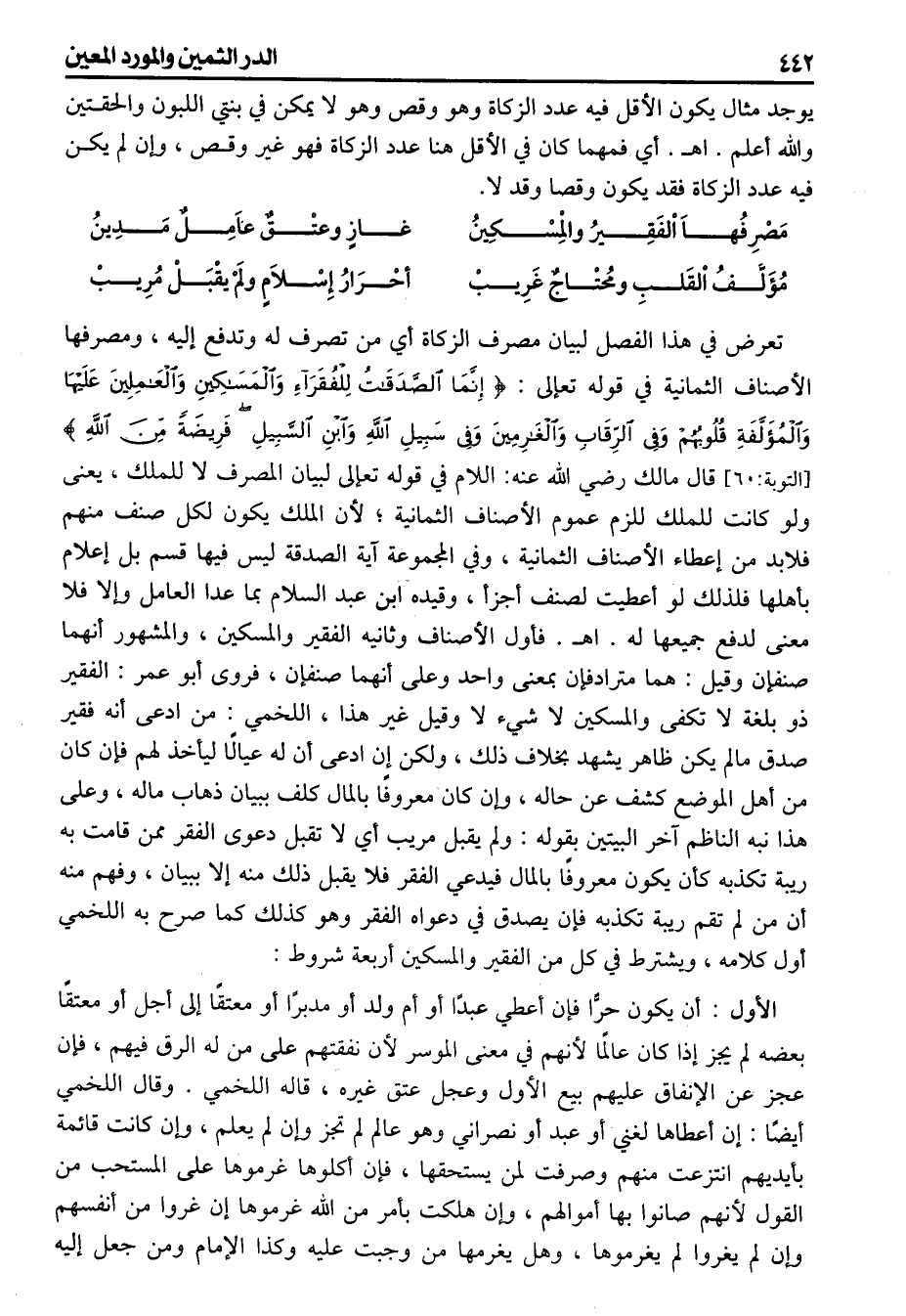 تعرض في هذا الفصل لبيان مصرف الزكاة أي من تصرف له وتدفع إليه، ومصرفها الاصناف الثمانية في قوله تعالى: " إنما الصدقات للفقراء والمساكين والعاملين عليها والمؤلفة قلوبهم وفي الرقاب والغارمين وفي سبيل الله وابن السبيل فريضة من الله " [التوبة: 60] قال مالك رضي الله عنه: اللام في قوله تعالى لبيان المصرف لا للملك، يعنى ولو كانت للملك للزم عموم الأصناف الثمانية؛ لأن الملك يكون لكل صنف منهم فلابد من إعطاء الأصناف الثمانية وفي المجموعة آية الصدقة ليس فيها قسم بل إعلام بأهلها فلذلك لو أعطيت لصنف أجزأ، وقيده ابن عبد السلام بما عدا العامل وإلا فلا معنى لدفع جميعها له. اهـ.