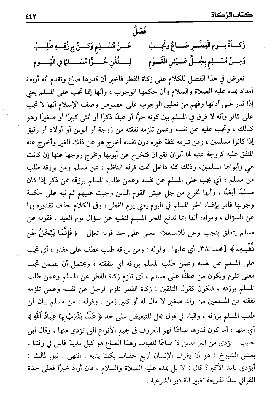 تعرض في هذا الفصل للكلام على زكاة الفطر فأخبر أن قدرها صاع وتقدم أنه أربعة أمداد بمده عليه الصلاة والسلام وأن حكمها الوجوب وأنها إنما تجب على المسلم يعني إذا قدر على أدائها وفهم من تعليق الوجوب على خصوص وصف الإسلام أنها لاتجب على كافر وأنه لافرق في المسلم بين كونه حراً أو عبداً ذكراً أو أنثى كبيراً أو صغيراً وهو كذلك وتجب عليه عن نفسه وعمن تلزمه نفقته من زوجة أو أبوين أو أولاد أو رقيق إذا كانوا مسلمين ومن تلزمه نفقة غيره دون نفسه أخرج هو عن ذلك الغير وأخرج عنه المنفق عليه كزوجة غنية لها أبوان فقيران فتخرج عن أبويها ويخرج زوجها عنها إن كانت هي وأبواها مسلمين، وذلك كله داخل تحت قوله الناظم عن مسلم ومن برزقه طلب من مسلم أي يجب على المسلم عن نفسه وعمن طلب المسلم برزقه ممن ذكر إذا كان مسلماً أيضا وأنها تخرج من جل عيش القوم الذين وجبت عليهم ثم نبه على حكمه وجوبها فأمر باغناء الحر المسلم في اليوم يعني يوم الفطر وفي الكلام حذف تقديره بها عن السؤال ومراده أنها إنما تدفع للحر المسلم لتغنيه عن سؤال يوم العيد فقوله عن مسلم يتعلق بتجب وعن للاستعلاء بمعنى على حد قوله تعالى {فإنما يبخل عن نفسه} أي عليها وقوله ومن برزقه طلب عطف على مقدر أي تجب على المسلم عن نفسه وعمن طلب المسلم برزقه أي بنفقته ويحتمل أن يضمن تجب معنى تلزم ويكون من عطفا على مسلم أي تلزم زكاة الفطر عن المسلم وعمن طلب المسلم برزقه فيكون كقول التلقين زكاة الفطر تلزم الرجل عن نفسه وعمن تلزمه نفقته من المسلمين من ولد صغير لا مال له أو كبير زمن وقوله من مسلم بيان لمن طلب المسلم برزقه والباء في قول بحل للتبعيض على حد عينا يشرب بها عباد الله أي منها أما كون قدرها صاعا فهو المعروف في جميع الأنواع التي تؤدي منها وقال ابن حبيب تؤدي من البر مدين لاصاعا للقباب وهذا الصاع هو كيل مدينة فاس في وقتنا بعض الشيوخ هو أن يغرف الإنسان أربع