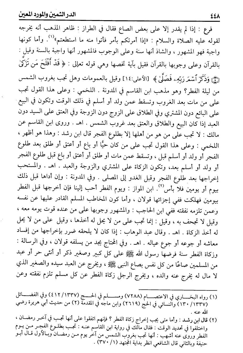 (فرع) إذا لم يقدر إلا على بعض الصاع فقال في الطراز ظاهر المذهب أنه يخرجه لقوله عليه الصلاة والسلام «إذا أمرتكم بأمر فأتوا منه مااستطعتم» وأما كونها واجبة فهو المشهور والشاذ إنها سنة وعلى الوجوب فالمشهور أنها واجبة بالسنة وقيل بالقرآن وعلى وجوبها بالقرآن فقيل بآية تخصها وهي قوله تعالى {قد أفلح من تزكى وذكر اسم ربه فصلى} وقيل بالعمومات وهل تجب بغروب الشمس من ليلة الفطر وهو مذهب ابن القاسم في المدونة اللخمي وعلى هذا القول تجب على من مات بعد الغروب وتسقط عمن ولد أو أسلم في ذلك الوقت وتكون في البيع على البائع دون المشتري وفي الطلاق على الزوج دون الزوجة وفي العتق على السيد دون العبد إذا كان البيع والطلاق والعتق بعد غروب الشمس اهـ وروى ابن القاسم عن مالك لاتجب على من هو من أهلها إلا بطلوع الفجر قال ابن رشد وهذا هو أظهر/ اللخمي وعلى هذا القول تجب على من كان حيا أو باع أو أعتق أو طلق بعد طلوع الفجر أو ولد أو أسلم قبل وتسقط عمن مات أو طلق أو أعتق أو باع قبل طلوع الفجر أو ولد أو أسلم بعد، وتكون الزكاة على المشتري والزوجة والعبد اهـ والمستحب إخراجها بعد طلوع الفجر وقبل الغدو إلى المصلى وفي المدونة وإن أداها قبل ذلك بيوم أو يومين فلا بأس ابن المواز ويوم الفطر أحب إلينا فإن أخرجها قبل الفطر بيومين فهلكت ففي إجزائها قولان وأما كون المخاطب المسلم القادر عليها عن نفسه وعمن تلزمه نفقته ففي ابن الحاجب والمشهور وجوبها على من عنده قوت يومه معه وقيل لاتجحف به وقيل إنما تجب على من لايحل له أخذها وقيل على من لايحل له أخذ الزكاة اهـ وقال عبد الوهاب إذا كان لا يلحقه ضرر باخراجها من إفساد معاشه أو جوعه أو جوع عياله اهـ وفي المحتاج يجد من يسلفه قولان، وفي الرسالة وزكاة الفطر سنة فرضها رسول الله على كل كبير وصغير ذكر أو أنثى حر أو عبد من المسلمين صاعا من كل نفس بصاع النبى ويخرج عن العبد سيده والصغير الذي لا مال له يخرج عنه والده ويخرج الرجل زكاة الفطر عن كل مسلم تلزم نفقته وعن