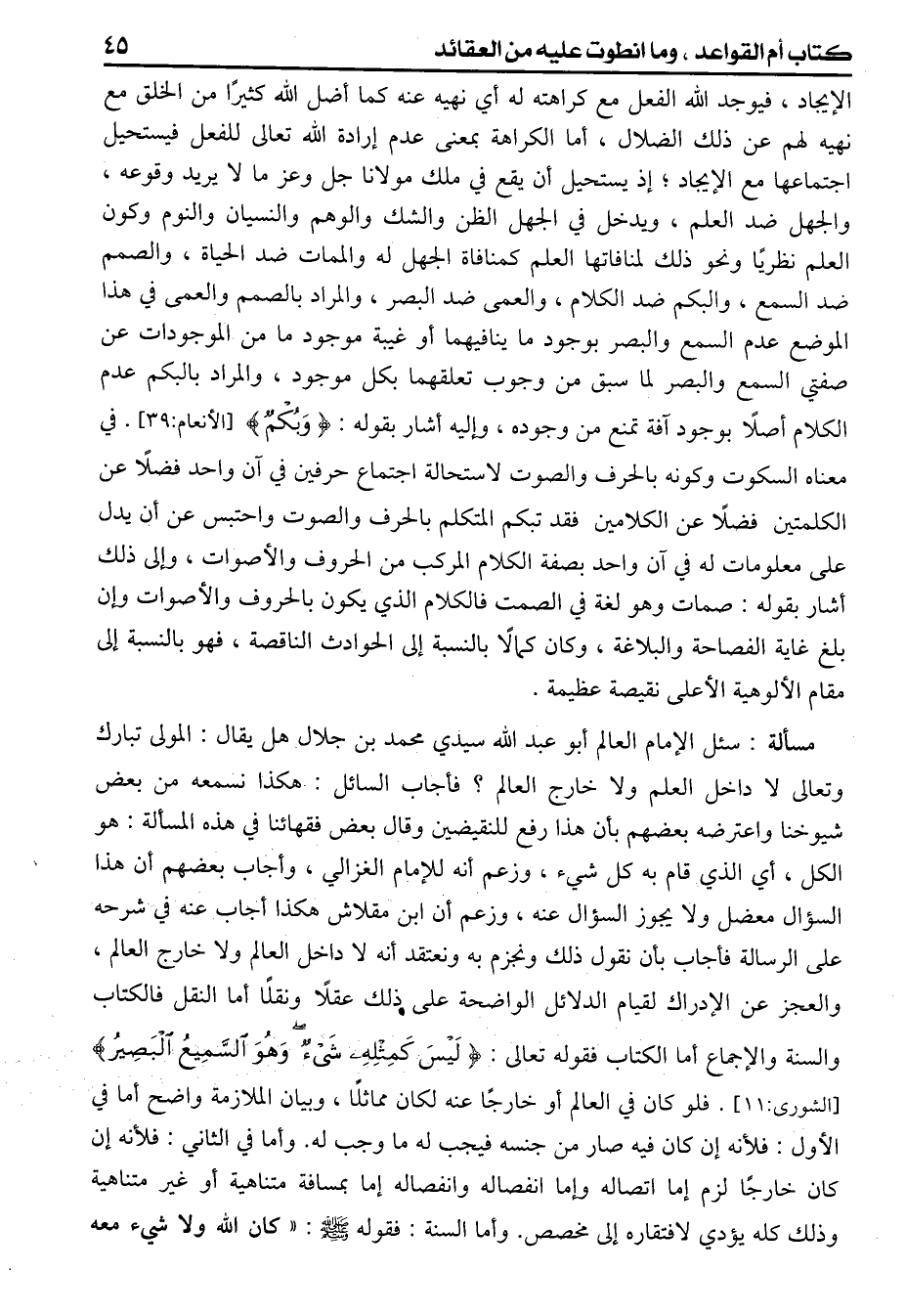الإيجاد فيوجد الله الفعل مع كراهته له أي نهيه عنه كما أضل الله كثيراً من الخلق مع نهيه لهم عن ذلك الضلال أما الكراهة بمعنى عدم إرادة الله تعالى للفعل فيستحيل إجتماعها مع الإيجاد إذ يستحيل أن يقع في ملك مولانا جل وعز ما لايريد وقوعه والجهل ضد العلم ويدخل في الجهل الظن والشك والوهم والنسيان والنوم وكون العلم نظرياً ونحوذلك لمنافاتها العلم كمنافاة الجهل له والممات ضد الحياة والصمم ضد السمع والبكم ضد الكلام والعمى ضد البصر والمراد بالصمم والعمى في هذا الموضع عدم السمع والبصر بوجود ماينافيهما أوغيبة موجود مامن الموجودات عن صفتي السمع والبصر لماسبق من وجوب تعلقهمابكل موجود والمراد بالبكم عدم الكلام أصلاً بوجود آفة تمنع من وجوده وإليه أشار بقوله وبكم وفي معناه السكوت وكونه بالحرف والصوت لاستحالة إجتماع حرفين في آن واحد فضلاً عن الكلمتين فقد تبكم المتكلم بالحرف والصوت واحتبس عن أن يدل على معلومات له في آن واحد بصفة الكلام المركب من الحروف والأصوات وإلى ذلك أشار بقوله صمات وهو لغة في الصمت فالكلام الذي يكون بالحروف والأصوات وإن بلغ غاية الفصاحة والبلاغة وكان كمالاً بالنسبة إلى الحوادث الناقصة فهوبالنسبة إلى مقام الألوهية الأعلى نقيصة عظيمة (مسئلة) سئل الإمام العالم