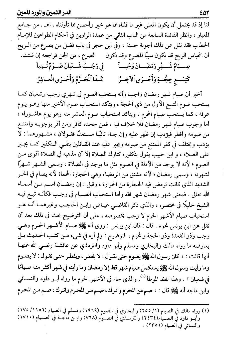 أخبر أن صيام شهر رمضان واجب وأنه يستحب الصوم في شهري رجب وشعبان كما يستحب صوم التسع الأول من ذي الحجة ويتأكد استحباب صوم الأخير منها وهو يوم عرفة كما يستحب صيام المحرم ويتأكد استحباب صوم العاشر منه وهو يوم عاشوراء أما وجوب صيام شهر رمضان فلا خلاف فيه فمن جحده كافر ومن أقر بوجوبه وامتنع من صومه وأفطر فيؤدب إن ظهر عليه وان جاء تائبا مستعتباً فقولان مشهورهما لايؤدب ويختلف في كفر الممتنع من صومه ويجبر عليه عند القائلين بنفي التكفير كما يجبر على الصلاة وابن حبيب يقول بتكفيره كتارك الصلاة إلا أن مذهبه في الصلاة أقوى من الصوم لأنه لايوجد من الأدلة في الصوم مثل مايوجد في الصلاة وسمى الشهر شهرا لشهرته وسمي رمضان لأنه مشتق من الرمضاء وهي الحجارة المحماة لأنه يصام في الحر الشديد الذى كانت ترمض فيه الحجارة من الحرارة وقيل إن رمضان اسم من أسماء الله تعالى فمعنى شهر رمضان شهر الله وأما استحباب الصيام في رجب فكأنه تبع فيه الشيخ خليلا في مختصره والذي ذكر القاضي عياض وابن الحاجب وغيرهما أنه هو استحباب صيام الأشهر الحرم لا رجب بخصوصه على أن التوضيح بحثا في ذلك بعد أن نقل عن ابن يونس نحوه قال قال ابن يونس روى أنه صام الاشهر الحرم وهي رجب وذو القعدة وذو الحجة والمحرم التوضيح ولم أره في شيء من كتب الحديث بل يعارضه مارواه مالك والبخاري ومسلم وأبو داود والترمذي عن عائشة رضي الله عنها انها قالت «كان رسول الله يصوم حتى نقول لايفطر ويفطر حتى نقول لايصوم وما رأيت رسول الله يستكمل صيام شهر قط الا رمضان وما رأيته في شهر أكثر منه صياما في شعبان» وهذا لفظ الموطأ والذي جاء في الأشهر الحرم مارواه أبوداود والنسائي وابن ماجه أنه قال صم من الحرم واترك صم من الحرم واترك صم من الحرم