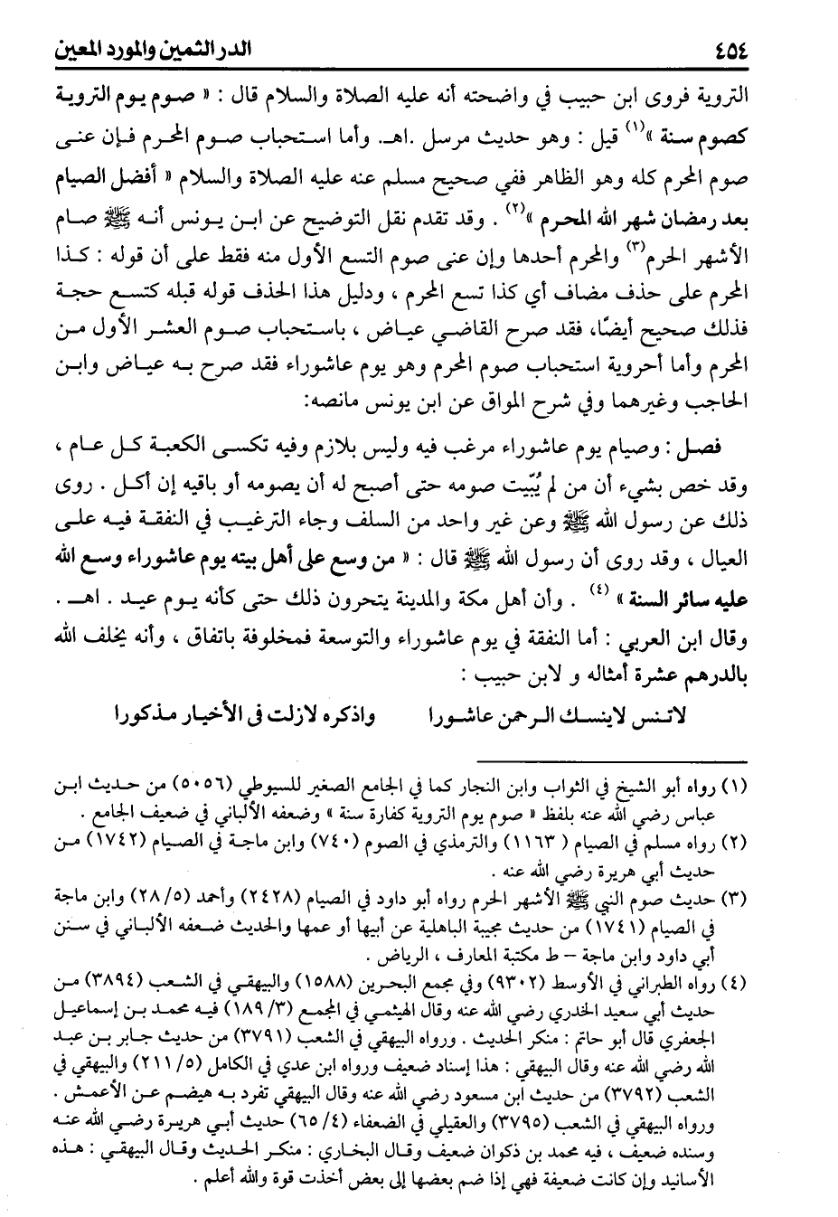 التروية فروى ابن حبيب في واضحته أنه عليه الصلاة والسلام قال «صوم يوم التروية كصوم سنة» قيل وهو حديث موسل اهـ. وأما استحباب صوم المحرم فإن عنى صوم المحرم كله وهو الظاهر ففي صحيح مسلم عنه عليه الصلاة والسلام أفضل الصيام بعد رمضان شهر الله المحرم وقد تقدم نفل التوضيح عن ابن يونس أنه صام الاشهر الحرم والمحرم أحدها وإن عنى صوم التسع الاول منه فقط على أن قوله كذا المحرم على حذف مضاف أي كذا تسع المحرم ودليل هذا الحذف قوله قبله كتسع حجة فذلك صحيح أيضاً، فقد صرح القاضي عياض باستحباب صوم العشر الأول من المحرم وأما أحروية استحباب صوم المحرم وهو يوم عاشوراء فقد صرح به عياض وابن الحاجب وغيرهما وفي شرح المواق عن ابن يونس مانصه