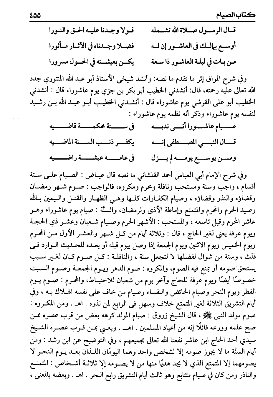 وفي شرح الإمام أبي العباس أحمد القلشاني مانصه قال عياض الصيام على ستة أقسام واجب وسنة ومستحب ونافلة ومحرم ومكروه، فالواجب صوم شهر رمضان وقضاؤه والنذر وقضاؤه وصيام الكفارات كلها وهي الظهار والقتل واليمين بالله وصيد الحرم والمحرم والمتمتع وإماطة الأذى ولرمضان، والسنة صيام يوم عاشوراء وهو عاشر المحرم وقيل تاسعه والمستحب الأشهر الحرم وصيام شعبان وعشر ذي الحجة ويوم عرفة يعني لغير الحاج قال وثلاثة أيام من كل شهر والعشر الأول من المحرم ويوم الخميس ويوم الاثنين ويوم الجمعة إذاوصل بيوم قبله أو بعده للحديث الوارد فى ذلك وستة من شوال لفضلها لا لتعجل ستة، والنافلة كل صوم كان لغير سبب يستحق صومه أو يمنع فيه الصوم، والمكروه صوم الدهر ويوم الجمعة وصوم السبت خصوصا أيضا ويوم عرفة للحاج وآخر يوم من شعبان للاحتياط، والمحرم صوم يوم الفطر ويوم النحر وصيام الحائض والنفساء وصيام من خاف على نفسه الهلاك به وفي أيام التشريق الثلاثة لغير المتمتع خلاف وسهل فى الرابع لمن نذره اهـ ومن المكروه صوم مولد النبى قال الشيخ زروق صيام المولد كرهه بعض من قرب عصره ممن صح علمه وورعه قائلا إنه من أعياد المسلمين اهـ ويعني بمن قرب عصره الشيخ سيدي أحد الحاج ابن عاشر نفعنا الله تعالى بجميعهم وفي التوضيح عن ابن رشد ومن أيام السنة ما لايجوز صومه إلا لشخص واحد وهما اليومان اللذان بعد يوم النحر لايصومهما إلا المتمتع الذي لايجد هديا منها من لايصومه إلا ثلاثة أشخاص المتمتع والناذر ومن كان في صيام متتابع وهو ثالث أيام التشريق رابع النحر اهـ وبعضه بالمعنى