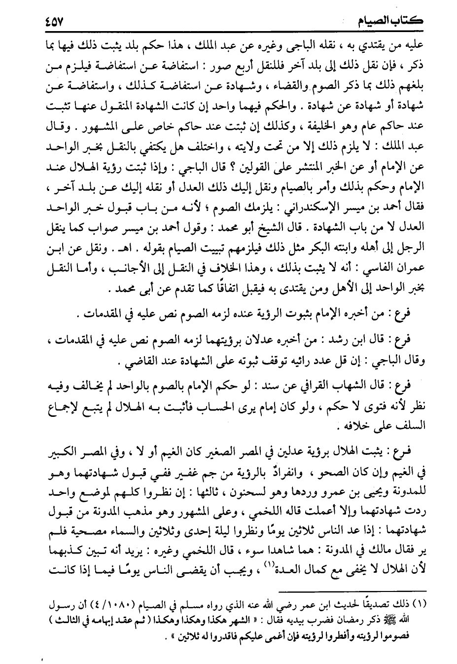 عليه من يقتدي به نقله الباجى وغيره عن عبد الملك هذا حكم بلد يثبت ذلك فيها بما ذكر فان نقل ذلك إلى بلد آخر فللنقل أربع صور استفاضة عن استفاضة فيلزم من بلغهم ذلك بما ذكر الصوم والقضاء وشهادة عن استفاضة كذلك واستفاضة عن شهادة أو شهادة عن شهادة والحكم فيهما واحد إن كانت الشهادة المنقول عنها تثبت عند حاكم عام وهو الخليفة وكذلك إن ثبتت عند حاكم خاص على المشهور وقال عبد الملك لايلزم ذلك إلا من تحت ولايته واختلف هل يكتفي بالنقل بخبر الواحد عن الإمام أو عن الخبر المنتشر على قولين قال الباجي وإذا ثبتت رؤية الهلال عند الإمام وحكم بذلك وأمر بالصيام ونقل إليك ذلك العدل أو نقله إليك عن بلد آخر فقال أحمد بن أيسر الاسكندراني يلزمك الصوم لأنه من باب قبول خبر الواحد العدل لا من باب الشهادة قال الشيخ أبو محمد وقول أحمد بن ميسر صواب كما ينقل الرجل إلى أهله وابنته البكر مثل ذلك فيلزمهم تبييت الصيام بقوله اهـ