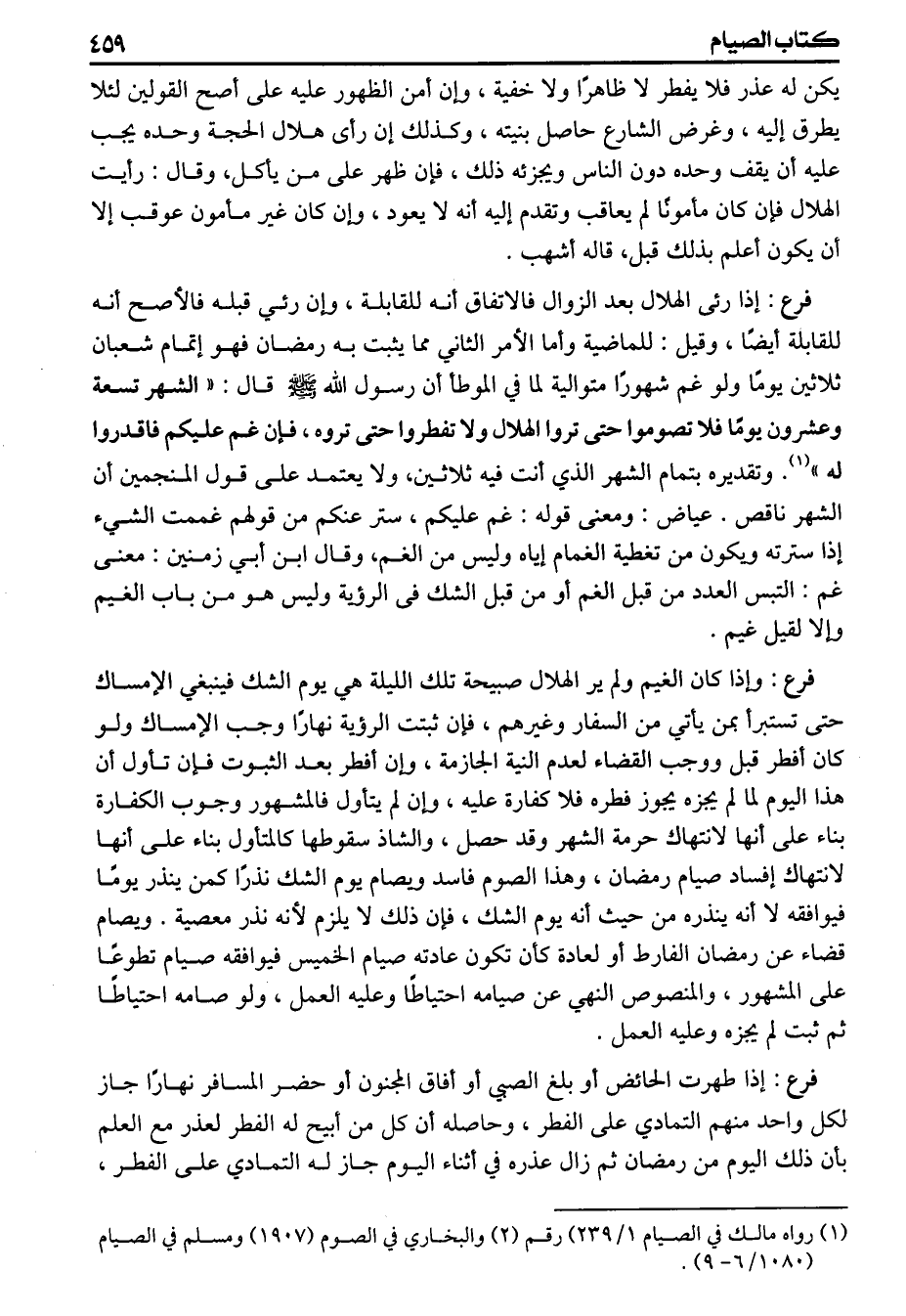 (فرع) إذا رأى الهلال بعد الزوال فالاتفاق أنه للقابلة وان رئي قبله فالأصح أنه للقابلة أيضا وقيل الماضية وأما الأمر الثاني مما يثبت به رمضان فهو اتمام شعبان ثلاثين يوما ولو غم شهورا متوالية لما في الموطأ أن رسول الله قال الشهر تسعة وعشرون يوما فلا تصوموا حتى تروا الهلال ولا تفطروا حتى تروه فان غم عليكم فاقدروا له وتقديره بتمام الشهر الذي أنت فيه ثلاثين، ولا يعتمد على قول المنجمين أن الشهر ناقص/ عياض ومعنى قوله غم عليكم ستر عنكم من قولهم غممت الشيء إذا سترته ويكون من تغطية الغمام إياه وليس من الغم، وقال ابن أبي زمنين معنى غم التبس العدد من قبل الغم أو من قبل الشك فى الرؤية وليس هو من باب الغيم وإلا لقيل غيم