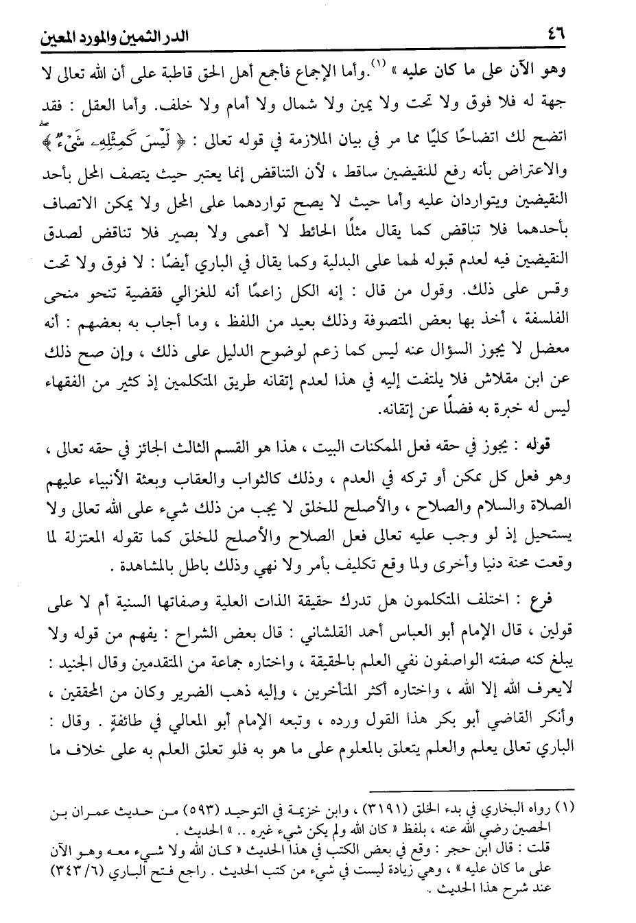 وهو الآن على ماكان عليه) وأماالإجماع فأجمع أهل الحق قاطبة على أن الله تعالى لاجهة له فلافوق ولاتحت ولايمين ولاشمال ولاأمام ولاخلف. وأما العقل فقد اتضح لك اتضاحاً كلياً مما مر في بيان الملازمة في قوله تعالى {ليس كمثله شيء} والاعتراض بأنه رفع للنقيضين ساقط لأن التناقض إنما يعتبر حيث يتصف المحل بأحد النقيضين ويتواردان عليه وأماحيث لايصح تواردهما على المحل ولايمكن الاتصاف بأحدهما فلاتناقض كمايقال مثلاً الحائط لاأعمى ولابصير فلاتناقض لصدق النقيضين فيه لعدم قبوله لهما على البدلية وكمايقال في الباري أيضاً لافوق ولاتحت وقس على ذلك. وقول من قال إنه الكل زاعماً أنه للغزالي فقضية تنحو منحى الفلسفة أخذ بها بعض المتصوفة وذلك بعيد من اللفظ وماأجاب به بعضهم أنه معضل لايجوز السؤال عنه ليس كما زعم لوضوح الدليل على ذلك وإن صح ذلك عن ابن مقلاش فلايلتفت إليه في هذا لعدم إتقانه طريق المتكلمين إذكثير من الفقهاء ليس له خبرة به فضلاً عن إتقانه. قوله يجوز في حقه فعل الممكنات البيت هذا هو القسم الثالث الجائز في حقه تعالى وهو فعل كل ممكن أوتركه في العدم وذلك كالثواب والعقاب وبعثة الأنبياء عليهم الصلاة والسلام والصلاح والأصلح للخلق لايجب من ذلك شيء على الله تعالى ولايستحيل إذ لو وجب عليه تعالى فعل الصلاح والأصلح للخلق كماتقوله المعتزلة لما وقعت محنة دنيا وأخرى ولما وقع تكليف بأمر ولانهي وذلك باطل بالمشاهدة (فرع) اختلف المتكلمون هل تدرك حقيقة الذات العلية وصفاتها السنية أم لا على قولين قال الإمام أبو العباس أحمد القلشاني قال بعض الشراح يفهم من قوله ولايبلغ كنه صفته الواصفون نفي العلم بالحقيقة واختاره جماعة من المتقدمين وقال الجنيد لايعرف الله إلا الله واختاره أكثر المتأخرين وإليه ذهب الضرير وكان من المحققين وأنكر القاضي أبوبكر هذا القول ورده وتبعه الإمام أبو المعالي في طائفةٍ. وقال: الباري تعالى يعلم والعلم يتعلق بالمعلوم على ماهو به فلو تعلق العلم به على خلاف ما