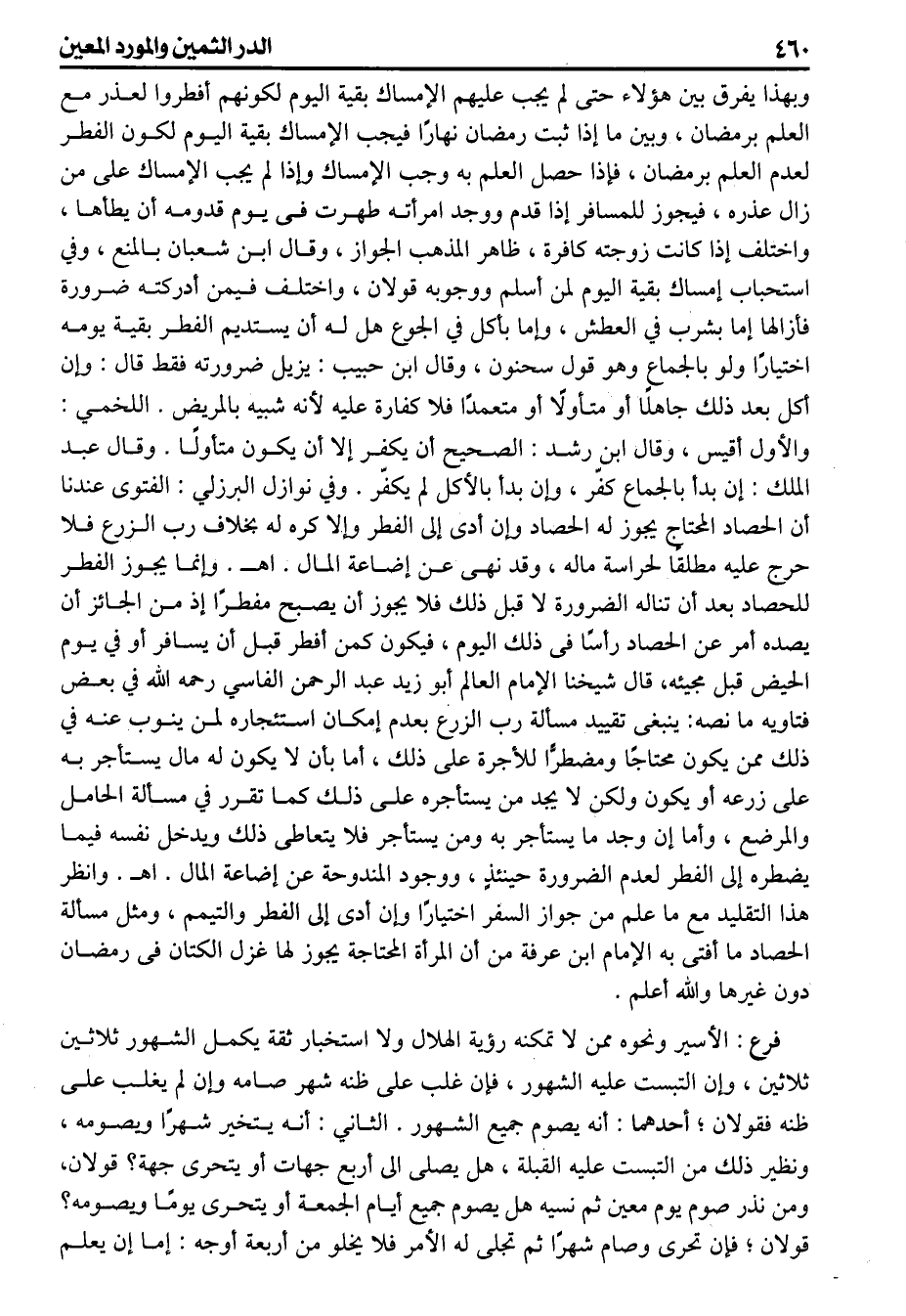 وبهذا يفرق بين هؤلاء حتى لم يجب عليهم الامساك بقية اليوم لكونهم أفطر والعذر مع العلم برمضان وبين ماإذا ثبت رمضان نهارا فيجب الامساك بقية اليوم لكون الفطر لعدم العلم برمضان فاذا حصل العلم به وجب الإمساك وإذا لم يجب الإمساك على من زال عذره فيجوز للمسافر إذا قدم ووجد امرأته طهرت فى يوم قدومه أن يطأها واختلف إذا كانت زوجته كافرة ظاهر المذهب الجواز وقال ابن شعبان بالمنع وفي استحباب إمساك بقية اليوم لمن أسلم ووجوبه قولان واختلف فيمن أدركته ضرورة فأزالها إما بشرب في العطش وإما بأكل في الجوع هل له أن يستديم الفطر بقية يومه اختيارا ولو بالجماع وهو قول سحنون وقال ابن حبيب يزيل ضرورته فقط قال وإن أكل بعد ذلك جاهلا أو متأولا أو متعمدا فلا كفارة عليه لأنه شبيه بالمريض اللخمي والأول أقيس وقال ابن رشد الصحيح أن يكفر إلا أن يكون متأولا وقال عبد الملك إن بدأ بالجماع كفر وإن بدأ بالأكل لم يكفر وفي نوازل البرزلي الفتوى عندنا أن الحصاد المحتاج يجوز له الحصاد وإن أدى إلى الفطر وإلا كره له بخلاف رب الزرع فلا حرج عليه مطلقا لحراسة ماله وقد نهى عن إضاعة المال اهـ وإنما يجوز الفطر للحصاد بعد أن تناله الضرورة لا قبل ذلك فلا يجوز أن يصبح مفطراً إذ من الجائز أن يصده أمر عن الحصاد رأسا فى ذلك اليوم فيكون كمن أفطر قبل أن يسافر أو في يوم الحيض قبل مجيئه، قال شيخنا الإمام العالم أبو زيد عبد الرحمن الفاسي رحمه الله في بعض فتاويه مانصه: ينبغى تقييد مسألة رب الزرع بعدم إمكان استئجاره لمن ينوب عنه في ذلك ممن يكون محتاجا ومضطرا للاجرة على ذلك اما بأن لايكون له مال يستأجر به على زرعه أو يكون ولكن لايجد من يستأجره على ذلك كما تقرر في مسألة الحامل والمرضع وأما إن وجد مايستأجر به ومن يستأجر فلا يتعاطى ذلك ويدخل نفسه فيما يضطره إلى الفطر لعدم الضرورة حينئذ ووجود المندوحة عن إضاعة المال اهـ وانظر هذا التقليد مع ماعلم من جواز السفر اختيارا وإن أدى إلى الفطر والتيمم ومثل مسألة الحصاد ماأفتى به الإمام ابن عرفة من أن المرأة المحتاجة يجوز لها غزل الكتان فى رمضان دون غيرها والله أعلم