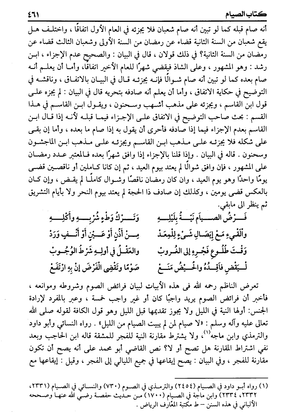 تعرض الناظم رحمه الله فى هذه الأبيات لبيان فرائض الصوم وشروطه وموانعه فأخبر أن فرائض الصوم يزيد واجبا كان أو غير واجب خمسة وعبر بالمفرد لارادة الجنس: أولها النية في الليل ولايجوز تقديمها قبل الليل وهو قول الكافة لقوله صلى الله تعالى عليه وآله وسلم «لاصيام لمن لم يبيت الصيام من الليل» رواه النسائي وأبو داود والترمذي وابن ماجه ولا يشترط مقارنة النية للفجر للمشقة قاله ابن الحاجب وبعد نفي اشتراط المقارنة هل تصح أو لا؟ نص القاضي أبو محمد على أنه يصح أن تكون مقارنة للفجر وفي البيان يصح ايقاعها في جميع الليالي إلى الفجر وقيل ايقاعها مع