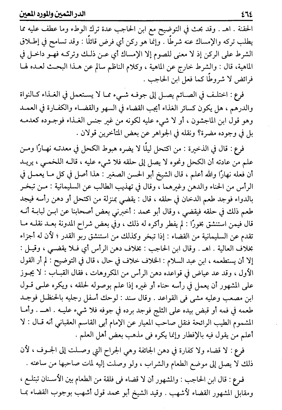 (فرع) اختلف في الصائم يصل إلى جوفه شيء مما لايستعمل في الغذاء كالنواة والدرهم هل يكون كسائر الغذاء ايجب القضاء في السهو والقضاء والكفارة في العمد وهو قول ابن الماجشون أو لا شيء عليه لكونه من غير جنس الغذاء فوجوده كعدمه بل في وجوده مضرة ونقله في الجواهر عن البعض المتاخرين قولان