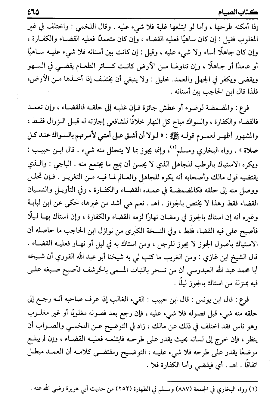 (فرع) والمضمضة لوضوء أو عطش جائزة فإن غلبه إلى حلقه فالقضاء وان تعمد فالقضاء والكفارة والسواك مباح كل النهار خلافا للشافعي اجازته له قبل الزوال فقط والمشهور أظهر لعموم قوله «لولا أن أشق على أمتي لأمرتهم بالسواك عند كل صلاة» رواه البخاري ومسلم وإنما يجوز بما لا يتحلل منه شيء قال ابن حبيب ويكره الاستياك بالرطب للجاهل الذي لايحسن أن يمج ما يجتمع منه الباجي والذي يقتضيه قول مالك وأصحابه أنه يكره للجاهل والعالم لما فيه من التغرير فان تحلل ووصل منه إلى حلقه فكالمضمضة في عمده القضاء والكفارة وفي التأويل والنسيان القضاء فقط وهذا لايختص بالجواز اهـ نعم هي أشد من غيرها، حكى عن ابن لبابة وغيره أنه ان استاك بالجوز في رمضان نهارا لزمه القضاء والكفارة وان استاك بها ليلا فأصبح على فيه القضاء فقط وفي النسخة الكبرى من نوازل ابن الحاجب ماحاصله أن الاستياك بأصول الجوز لايجوز للرجل ومن استاك به في ليل أو نهار فعليه القضاء قال الشيخ ابن غازي ومن الغريب ماكتب لي به شيخنا أبو عبد الله القوري أن شيخه أبا محمد عبد الله العبدوسي أن من تسحر بالنبات المسمى بالخرشف فأصبح صبغه على فيه بمنزلة من استاك بالجوز ليلا