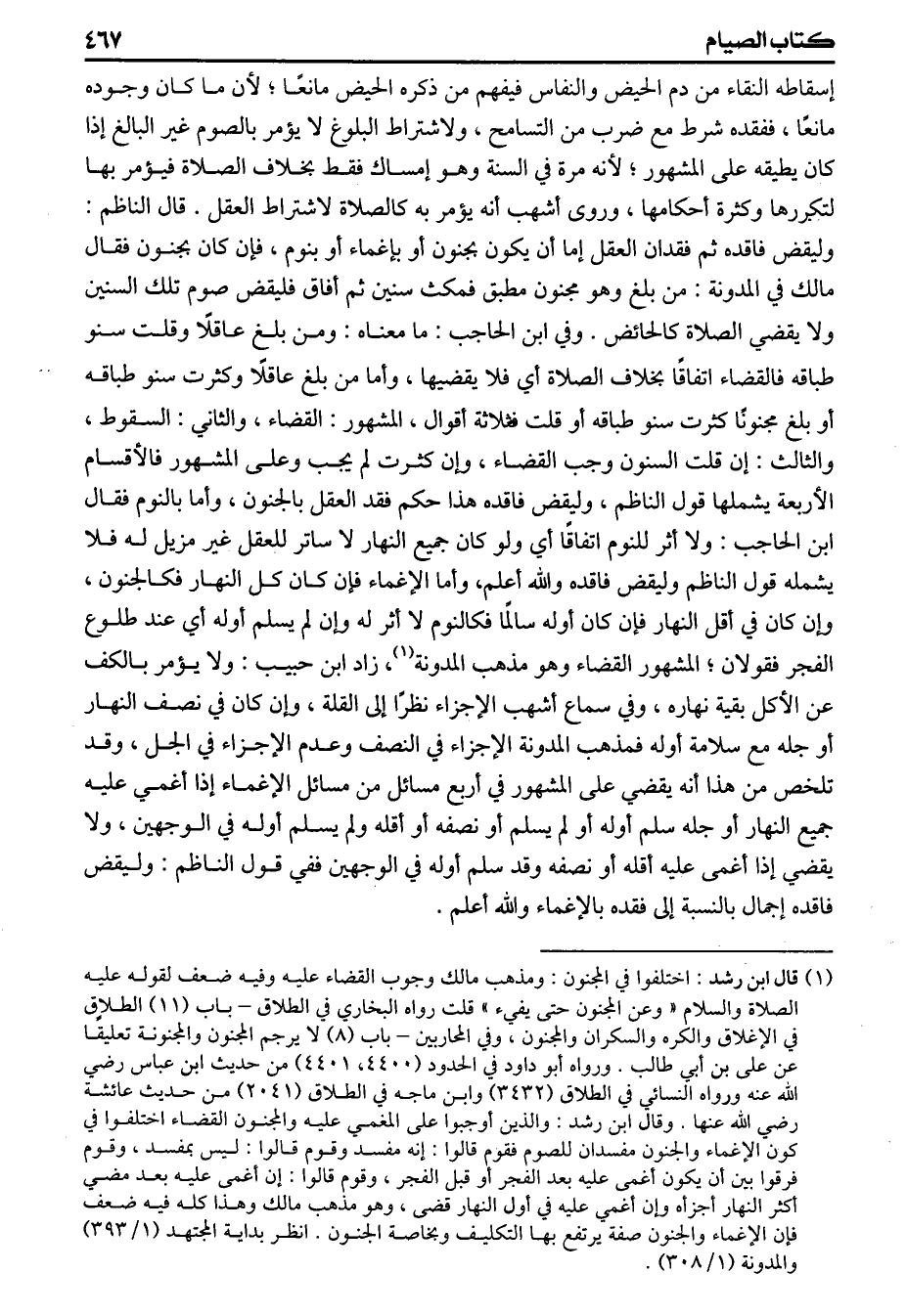 إسقاطه النقاء من دم الحيض والنفاس فيفهم من ذكره الحيض مانعاً لأن ما كان وجوده مانعاً ففقده شرط مع ضرب من التسامح ولاشتراط البلوغ لايؤمر بالصوم غير البالغ اذا كان يطيقه على المشهور لأنه مرة في السنة وهو امساك فقط بخلاف الصلاة فيؤمر بها لتكررها وكثرة أحكامها وروى أشهب أنه يؤمر به كالصلاة لاشتراط العقل قال الناظم وليقض فاقده ثم فقدان العقل اما أن يكون بجنون أو باغماء أو بنوم فان كان بجنون فقال مالك في المدونة من بلغ وهو مجنون مطبق فمكث سنين ثم أفاق فليقض صوم تلك السنين ولايقضي الصلاة كالحائض وفي ابن الحاجب مامعناه ومن بلغ عاقلا وقلت سنو طباقه فالقضاء اتفاقا بخلاف الصلاة أي فلا يقضيها وأما من بلغ عاقلا وكثرت سنو طباقه أو بلغ مجنونا كثرت سنو طباقه أو قلت فثلاثة أقوال المشهور القضاء والثاني السقوط والثالث ان قلت السنون وجب القضاء وان كثرت لم يجب وعلى المشهور فالأقسام الأربعة يشملها قول الناظم وليقض فاقده هذا حكم فقد العقل بالجنون وأما بالنوم فقال ابن الحاجب ولا أثر للنوم اتفاقا أي ولو كان جميع النهار لاساتر للعقل غير مزيل له فلا يشمله قول الناظم وليقض فاقده والله أعلم، وأما الاغماء فان كان كل النهار فكالجنون وإن كان في أقل النهار فان كان أوله سالما فكالنوم لا أثر له وان لم يسلم أوله أي عند طلوع الفجر فقولان المشهور القضاء وهو مذهب المدونة زاد ابن حبيب ولا يؤمر بالكف عن الأكل بقية نهاره وفي سماع أشهب الاجزاء نظراً إلى القلة وان كان في نصف النهار أو جله مع سلامة أوله فمذهب المدونة الاجزاء في النصف وعدم الإجزاء في الجل وقد تلخص من هذا أنه يقضي على المشهور في أربع مسائل من مسائل الاغماء إذا أغمي عليه جميع النهار أو جله سلم أوله أو لم يسلم أو نصفه أو أقله ولم يسلم أوله في الوجهين ولايقضي إذا أغمى عليه أقله أو نصفه وقد سلم أوله في الوجهين ففي قول الناظم وليقض فاقده إجمال بالنسبة إلى فقده بالاغماء والله أعلم.