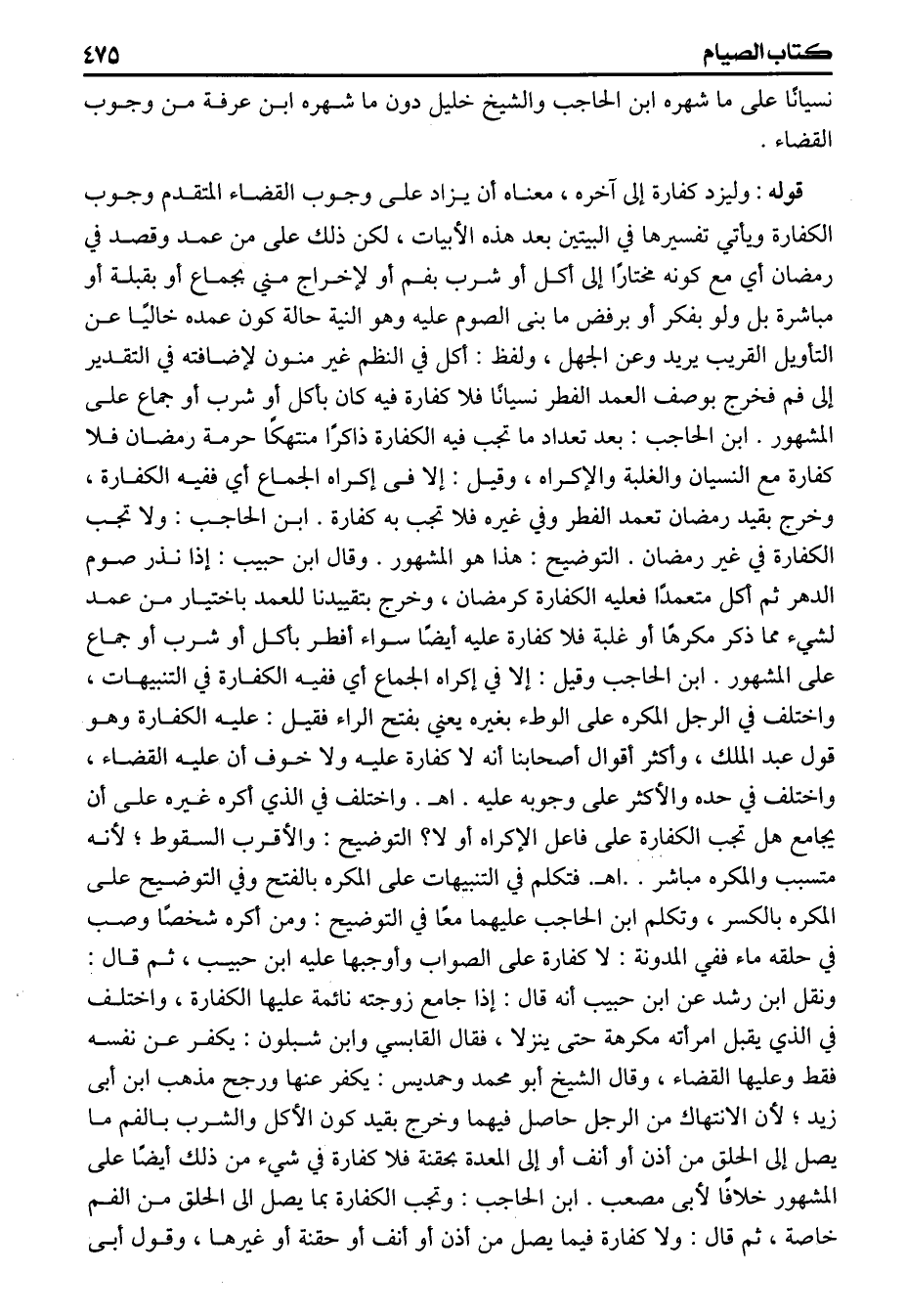 قوله (وليزد كفارة) إلى آخره معناه أن يزاد على وجوب القضاء المتقدم وجوب الكفارة ويأتي تفسيرها في البيتين بعد هذه الأبيات لكن ذلك على من عمد وقصد في رمضان أي مع كونه مختارا إلى أكل أو شرب بفم أو لإخراج مني بجماع أو بقبلة أو مباشرة بل ولو بفكر أو برفض ما بنى الصوم عليه وهو النية حالة كون عمده خاليا عن التأويل القريب يريد وعن الجهل ولفظ (أكل) في النظم غير منون لإضافته في التقدير إلى فم فخرج بوصف العمد الفطر نسيانا فلا كفارة فيه كان بأكل أو شرب أو جماع على المشهور ابن الحاجب بعد تعداد ماتجب فيه الكفارة ذاكرا منتهكا حرمة رمضان فلا كفارة مع النسيان والغلبة والإكراه وقيل إلا فى إكراه الجماع أي ففيه الكفارة وخرج بقيد رمضان تعمد الفطر وفي غيره فلا تجب به كفارة ابن الحاجب ولاتجب الكفارة في غير رمضان التوضيح هذا هو المشهور وقال ابن حبيب إذا نذر صوم الدهر ثم أكل متعمدا فعليه الكفارة كرمضان وخرج بتقيدنا للعمد باختيار من عمد لشيء مما ذكر مكرها أو غلبة فلا كفارة عليه أيضا سواء أفطر بأكل أو شرب أو جماع على المشهور ابن الحاجب وقيل إلا في إكراه الجماع أي ففيه الكفارة في التنبيهات واختلف في الرجل المكره على الوطء بغير يعني بفتح الراء فقيل عليه الكفارة وهو قول عبد الملك وأكثر أقوال أصحابنا أنه لاكفارة عليه ولاخوف أن عليه القضاء واختلف في حده والأكثر على وجوبه عليه اهـ واختلف في الذي أكره غيره على أن يجامع هل تجب الكفارة على فاعل الاكراه اولا التوضيح والأقرب السقوط لأنه متسبب والمكره مباشر اهـ فتكلم في التنبيهات على المكره بالفتح وفي التوضيح على المكره بالكسر وتكلم ابن الحاجب عليهما معاً في التوضيح ومن أكره شخصا وصب في حلقه ماء ففي المدونة لاكفارة عل الصاب وأوجبها عليه ابن حبيب ثم قال ونقل ابن رشد عن ابن حبيب أنه قال إذا جامع زوجته نائمة عليها الكفارة واختلف في الذي يقبل امرأته مكرهة حتى ينزلا فقال القابسي وابن شبلون يكفر عن نفسه فقط وعليها القضاء وقال الشيخ أبو محمد وحمديس يكفر عنها ورجح مذهب ابن أبى زيد لأن الانتهاك من الرجل حاصل فيهما وخرج بقيد كون الأكل والشرب بالفم مايصل إلى الحلق من أذن أو أنف أو الى المعدة بحقنة فلا كفارة في شيء من ذلك أيضاً على المشهور خلافا لأبى مصعب ابن الحاجب وتجب الكفارة بما يصل الى الحلق من الفم خاصة ثم قال ولاكفارة فيما يصل من أذن أو أنف أو حقنة أو غيرها وقول أبى