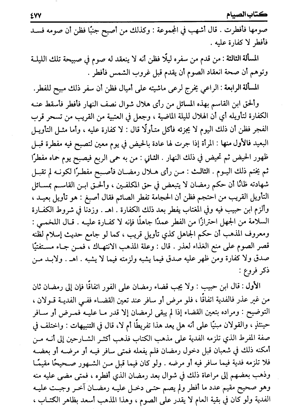 الثالث من رأى هلال رمضان فأصبح مفطرا لكونه لم تقبل شهادته ظانا أن حكم رمضان لايتبعض في حق المكلفين وألحق ابن القاسم بمسائل التأويل القريب من احتجم فظن ان الحجامة تفطر الصائم فقال أصبغ هو تأويل بعيد وألزم ابن حبيب فيه وفي المغتاب يفطر بعد ذلك الكفارة اهـ وزدنا في شروط الكفارة السلامة من الجهل احترازا من الفطر عمدا جاهلا فانه لا كفارة عليه قال اللخمي ومعروف المذهب أن حكم الجاهل كذا تأويل قريب كما لو جامع حديث إسلام لظنه قصر الصوم على منع الغذاء لعذر قال وعلة المذهب الانتهاك فمن جاء مستفتيا صدق ولا كفارة ومن ظهر عليه صدق فيما يشبه ولزمته فيما لايشبه اهـ ولابد من ذكر فروع الأول قال ابن حبيب ولايجب قضاء رمضان على الفور اتفاقا فان إلى رمضان ثان من غير عذر فالفدية اتفاقا فلو مرض أو سافر عند تعين القضاء ففي الفدية قولان التوضيح ومراده بتعين القضاء إذا لم يبقى لرمضان إلا قدر ماعليه فمرض أو سافر حينئذ والقولان مبنيا على أنه هل يعد هذا تفريطا أم لا، لتجديدها ويصدق مع عدم التتابع وانقطاعه كالحائض والمسافر والمريض إذا أفطر ثم أراد الصوم فلا بد لهما من تجديدها أيضا ثم ان كان صومها بعد أن حضر المسافر وصح المريض كفتهما نية واحدة لبقية الصوم وإن كان صوم المسافر في السفر وصوم المريض في المرض فلابد لهما من التجديد كل ليلة حتى ينقضي السبب الذي نفى وجوب التتابع وهو المرض والسفر كما مر قريباً عن العتبية وهذا التفصيل جار في رمضان مطلقا وفي الكفارات الواجب تتابعها باعتبار المرض إذا أفطر له وأما باعتبار السفر فلا، لأنه إذا أفطر له انقطع تتابعه وابتدأ الصوم من أوله كما يأتي فلا يتصور فيه تجديد النية لبقية الصوم وأنظر إذا سافر في صيام الكفارات ولم يفطر في سفره أو مرض وتكلف الصوم هل يجب عليه تجديد النية كل ليلة كما في رمضان على قول قال في التنبيهات واختلف في صفة المفرط الذي تلزمه الفدية على مذهب