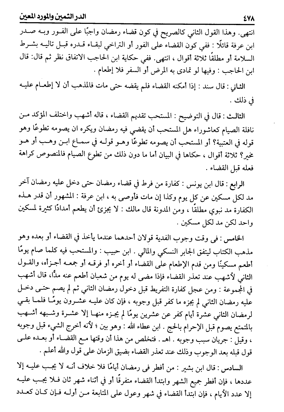الرابع قال ابن يونس كفارة من فرط في قضاء رمضان حتى دخل عليه رمضان آخر مد لكل مسكين عن كل يوم وكذا إن مات فأوصى به ابن عرفة المشهور ان قدر هذه الكفارة مد نبوى مطلقا ومن المدونة قال مالك لايجزىء أن يطعم أمداد كثيرة لمسكين واحد لكن مد لكل مسكين