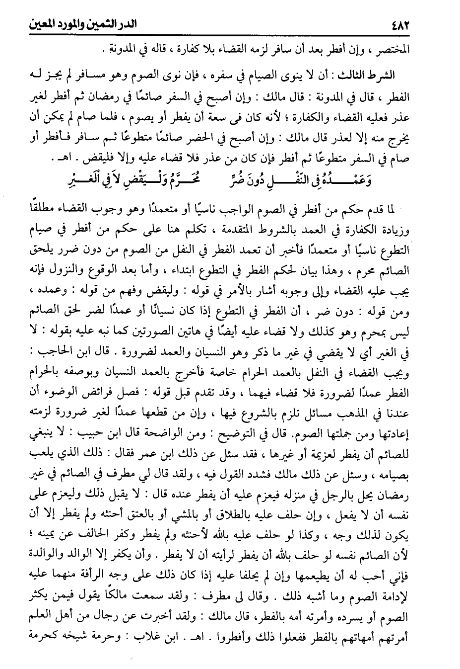 لما قدم حكم من أفطر في الصوم الواجب ناسيا أو متعمدا وهو وجوب القضاء مطلقا وزيادة الكفارة في العمد بالشروط المتقدمة تكلم هنا على حكم من أفطر في صيام التطوع ناسياً أو متعمداً فأخبر إن تعمد الفطر في النفل من الصوم من دون ضرر يلحق الصائم محرم وهذا بيان لحكم الفطر في التطوع إبتداء وأما بعد الوقوع والنزول فانه يجب عليه القضاء وإلى وجوبه أشار بالأمر في قوله وليقض وفهم من قوله وعمده ومن قوله دون ضر أن الفطر في التطوع إذا كان نسيانا أو عمداً لضر لحق الصائم ليس بمحرم وهو كذلك ولاقضاء عليه أيضاً في هاتين الصورتين كما نبه بقوله لا في الغير أي لايقضي في غير ماذكر وهو النسيان والعمد لضرورة قال ابن الحاجب ويجب القضاء في النفل بالعمد الحرام خاصة فأخرج بالعمد النسيان وبوصفه بالحرام الفطر عمداً لضرورة فلا قضاء فيهما وقد تقدم قبل قوله [فصل فرائض الوضوء] أن عندنا في المذهب مسائل تلزم بالشروع فيها وان من قطعها عمداً لغير ضرورة لزمته إعادتها ومن جملتها الصوم، قال في التوضيح ومن الواضحة قال ابن حبيب لاينبغي للصائم أن يفطر لعزيمة أو غيرها فقد سئل عن ذلك ابن عمر فقال ذلك الذي يلعب بصيامه وسئل عن ذلك مالك فشدد القول فيه ولقد قال لي مطرف في الصائم في غير رمضان يحل بالرجل في منزله فيعزم عليه أن يفطر عنده قال لايقبل ذلك وليعزم على نفسه أن لايفعل وإن حلف عليه بالطلاق أو بالمشي أو بالعتق أحنثه ولم يفطر إلا أن يكون لذلك وجه وكذا لو حلف عليه بالله لأحنثه ولم يفطر وكفر الحالف عن يمينه لأن الصائم نفسه لو حلف بالله أن يفطر لرأيته أن لا يفطر وأن يكفر إلا الوالد والوالدة فإني أحب له أن يطيعمها وان لم يحلفا عليه إذا كان ذلك على وجه الرأفة منهما عليه لادامة الصوم وماأشبه ذلك وقال لى مطرف ولقد سمعت مالكا يقول فيمن يكثر الصوم أو يسرده وأمرته أمه بالفطر، لتجديدها ويصدق مع عدم التتابع وانقطاعه كالحائض والمسافر والمريض إذا أفطر ثم أراد الصوم فلا بد لهما من تجديدها أيضا ثم ان كان صومها بعد أن حضر المسافر وصح المريض كفتهما نية واحدة لبقية الصوم وإن كان صوم المسافر في السفر وصوم المريض في المرض فلابد لهما من التجديد كل ليلة حتى ينقضي السبب الذي نفى وجوب التتابع وهو المرض والسفر كما مر قريباً عن العتبية وهذا التفصيل جار في رمضان مطلقا وفي الكفارات الواجب تتابعها باعتبار المرض إذا أفطر له وأما باعتبار السفر فلا، لأنه إذا أفطر له انقطع تتابعه وابتدأ الصوم من أوله كما يأتي فلا يتصور فيه تجديد النية لبقية الصوم وأنظر إذا سافر في صيام الكفارات ولم يفطر في سفره أو مرض وتكلف الصوم هل يجب عليه تجديد النية كل ليلة كما في رمضان على قول قال مالك ولقد أخبرت عن رجال من أهل العلم أمرتهم أمهاتهم بالفطر ففعلوا ذلك وأفطروا اهـ ابن غلاب وحرمة شيخه كحرمة