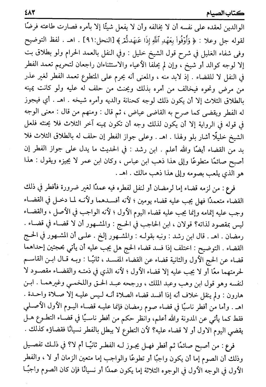 الوالدين لعقده على نفسه أن لايخالفه وأن لايفعل شيئاً إلا بأمره فصارت طاعته فرضا لقوله جل وعلا وأوفوا بعهد الله إذا عاهدتماهـ لفظ التوضيح وفى شفاء الغليل في شرح قول الشيخ خليل وفي النفل بالعمد الحرام ولو بطلاق بت الا لوجه كوالد أو شيخ وان لم يحلفا الاعياء والاستثناءان راجعان لتحريم تعمد الفطر في النفل لا للقضاء إذ لابد منه والمعنى أنه يحرم على المتطوع تعمد الفطر لغير عذر من مرض ونحوه فيخالف من أمره بذلك ويحنث من حلف له عليه ولو كانت يمينه بالطلاق الثلاث إلا أن يكون ذلك لوجه كحنانة والديه وأمره شيخه اهـ أي فيجوز له الفطر ويقضى كما صرح به القاضى عياض ثم قال ومنهم من قال معنى الوجه في قوله في الرواية إلا أن يكون لذلك وجه أن تكون يمينه آخر الثلاث فلا يحنثه فلعل الشيخ خليلا أشار بلو ولهذا وعلى جواز الفطر إن حلف له بالطلاق الثلاث فلابد من القضاء أيضا والله أعلم/ ابن رشد في الحديث مايدل على جواز الفطر إن أصبح صائما متطوعا وإلى هذا ذهب ابن عباس وكان ابن عمر لايجيزه ويقول هذا هو الذي يلعب بصومه وإلى هذا ذهب مالك اهـ