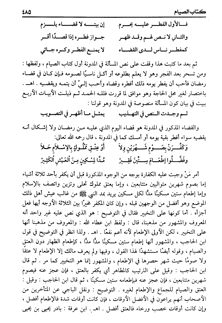 أمر وجبت عليه الكفارة بوجه من الوجوه المذكورة قبل أن يكفر بأحد ثلاثة أشياء إما بصوم شهرين متواليين متتابعين وإما يعتق مملوك تحلى وتزين واتصف بالاسلام وإما إطعام ستين مسكينا مدا لكل مسكين يريد بمد النبي صلى الله عليه وسلم من غالب عيش أهل ذلك الموضع وهو أفضل من الوجهين قبله وإن كان المكفر مخيراً بين الثلاثة الأوجه أيها فعل أجزأه أما كونها على التخيير فقال في التوضيح هو الذي نص عليه غير واحد أنه المعروف والمشهور من مذهبنا، قال ولفظ ابن عطاء الله والمعروف من مذهبنا أنها على التخيير لكن الأولى الإطعام لأنه أعم نفعاً اهـ ولذا انظر في التوضيح في قول ابن الحاجب والمشهور أنها إطعام ستين مسكينا مداً مداً كإطعام الظهار دون العتق والصيام وقوله أيضا مستشهدا لهذا القول وفيها ولم يعرف مالك إلا الإطعام لا عتقا ولا صوما حيث شهر حصرها في الاطعام والمشهور إنما هو التخيير كما مر ثم قال ابن الحاجب وقيل على الترتيب كالمظاهر أي يكفر بالعتق فإن عجز عنه فيصوم شهرين متتابعين فإن عجز عنه فباطعامه ستين مسكينا ثم قال ابن الحاجب وقيل العتق والصيام للجماع والإطعام لغيره التوضيح ونقل الباجي عن المتأخرين من الأصحاب أنهم يراعون في الأفضل الأوقات فإن كانت أوقات شدة فالإطعام أفضل وإن كانت أوقات خصب ورخاء فالعتق أفضل اهـ ابن عرفة بادر يحيى بن يحيى