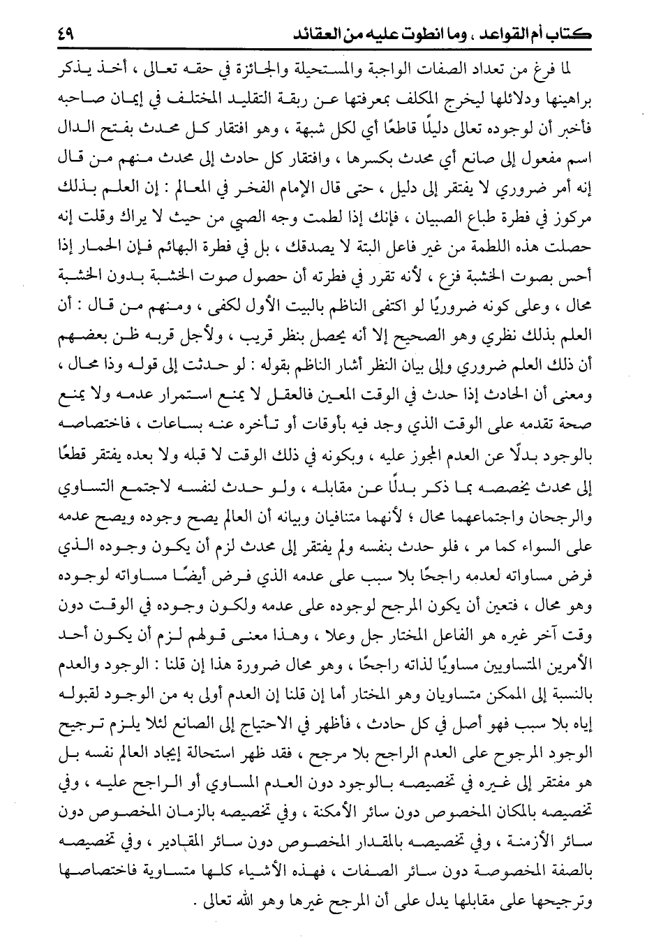 أما إن قلنا إن العدم أولى به من الوجود لقبوله إياه بلا سبب فهو أصل في كل حادث فأظهر في الاحتياج إلى الصانع لئلا يلزم ترجيح الوجود المرجوح على العدم الراجح بلا مرجح فقد ظهر استحالة المخصوص دون سائر الأمكنة وفي تخصيصه بالزمان المخصوص دون سائر الأزمنة وفي تخصيصه بالمقدار المخصوص دون سائر المقادير وفي تخصيصه بالصفة المخصوصة دون سائر الصفات فهذه الأشياء كلها متساوية فاختصاصها وترجيحها على مقابلها يدل على أن المرجح غيرها وهو الله تعالى.