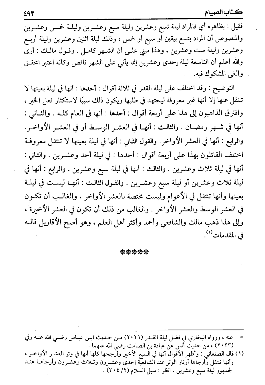 فقيل بظاهره أي فالمراد ليلة تسع وعشرين وليلة سبع وعشرين وليلة خمس وعشرين والمنصوص أن المراد بتسع بيقين أو سبع أو خمس وذلك ليلة اثنين وعشرين وليلة أربع وعشرين وليلة ست وعشرين وهذا مبني على أن الشهر كامل وقول مالك أرى والله أعلم أن التاسعة ليلة إحدى وعشرين إنما يأتي على الشهر ناقص وكأنه اعتبر المحقق وألغى المشكوك فيه، لتجديدها ويصدق مع عدم التتابع وانقطاعه كالحائض والمسافر والمريض إذا أفطر ثم أراد الصوم فلا بد لهما من تجديدها أيضا ثم ان كان صومها بعد أن حضر المسافر وصح المريض كفتهما نية واحدة لبقية الصوم وإن كان صوم المسافر في السفر وصوم المريض في المرض فلابد لهما من التجديد كل ليلة حتى ينقضي السبب الذي نفى وجوب التتابع وهو المرض والسفر كما مر قريباً عن العتبية وهذا التفصيل جار في رمضان مطلقا وفي الكفارات الواجب تتابعها باعتبار المرض إذا أفطر له وأما باعتبار السفر فلا، لأنه إذا أفطر له انقطع تتابعه وابتدأ الصوم من أوله كما يأتي فلا يتصور فيه تجديد النية لبقية الصوم وأنظر إذا سافر في صيام الكفارات ولم يفطر في سفره أو مرض وتكلف الصوم هل يجب عليه تجديد النية كل ليلة كما في رمضان على قول التوضيح وقد اختلف على ليلة القدر في ثلاثة أقوال أحدها أنها في ليلة بعينها لا تنتقل عنها إلا أنها غير معروفة ليجتهد في طلبها ويكون ذلك سببا لاستكثار فعل الخير وافترق الذاهبون الى هذا على أربعة أقوال أحدها أنها في العام كله والثاني أنها في شهر رمضان والثالث أنها في العشر الوسط أو في العشر الأواخر والرابع أنها في العشر الأواخر والقول الثاني أنها في ليلة بعينها لا تنتقل معروفة اختلف القائلون بهذا على أربعة أقوال أحدها في ليلة أحد وعشرين والثاني أنها في ليلة ثلاث وعشرين والثالث أنها في ليلة سبع وعشرين والرابع أنها في ليلة ثلاث وعشرين أو ليلة سبع وعشرين والقول الثالث أنها ليست في ليلة بعينها وأنها تنتقل في الأعوام وليست مختصة بالعشر الأواخر والغالب أن تكون في العشر الوسط والعشر الأواخر والغالب من ذلك أن تكون في العشر الأخيرة وإلى هذا ذهب مالك والشافعي وأحمد وأكثر أهل العلم وهو أصح الأقاويل قاله في المقدمات