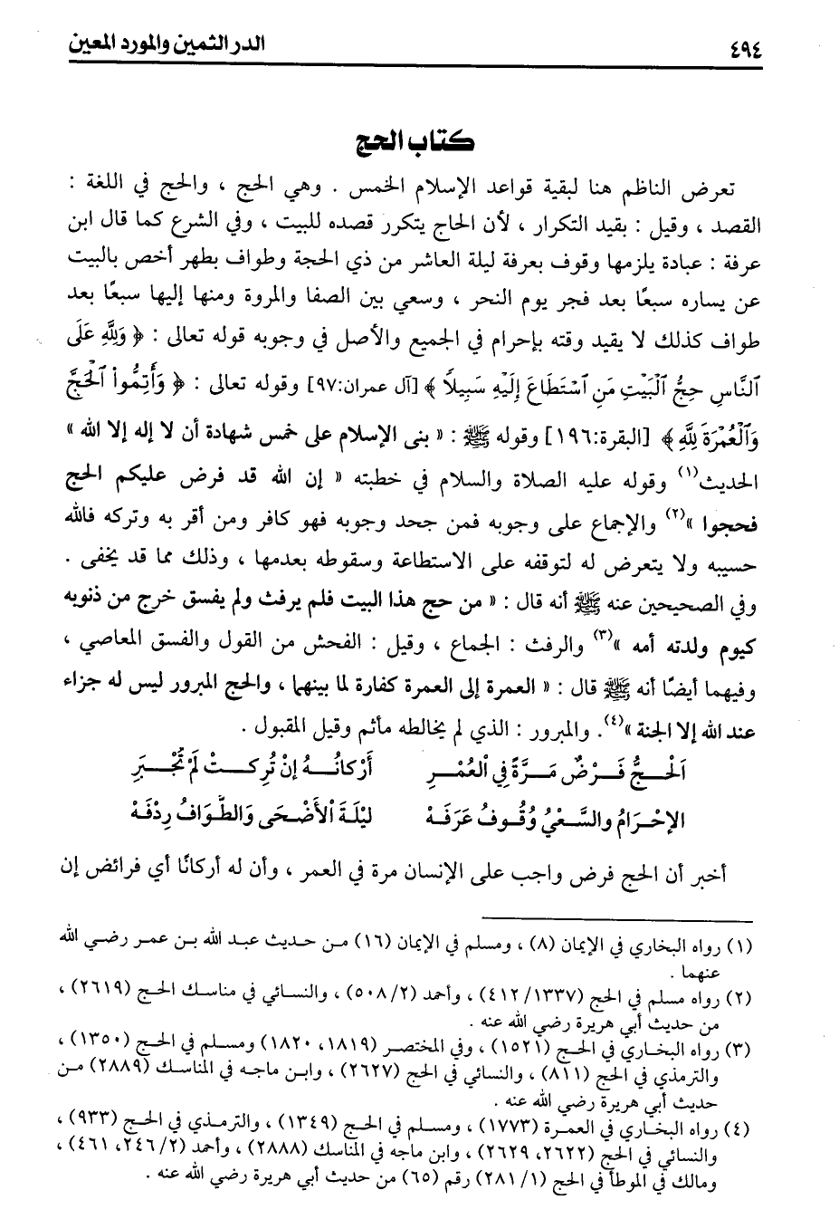تعرض الناظم هنا لبقية قواعد الإسلام الخمس وهي الحج والحج في اللغة القصد وقيل بقيد التكرار لأن الحج يتكرر قصده للبيت وفي الشرع كما قال ابن عرفة عبادة يلزمها وقوف بعرفة ليلة العاشر من ذي الحجة وطواف بطهر أخص بالبيت عن يساره سبعا بعد فجر اليوم النحر وسعي بين الصفا والمروة ومنها اليها سبعا بعد طواف كذلك لا يقيد وقته باحرام في الجميع والأصل في وجوبة قوله تعالى {ولله على الناس حج البيت من استطاع اليه سبيلا} وقوله تعالى {وأتموا الحج والعمرة لله} قوله صلى الله عليه وسلم «بنى الاسلام على خمس شهادة أن لا إله الا الله» الحديث وقوله عليه الصلاة والسلام في خطبته «إن الله قد فرض عليكم الحج فحجوا» والاجماع على وجوبه فمن جحد وجوبه فهو كافر ومن أقر به وتركه فالله حسيبه ولا يتعرض له لتوقفه على الاستطاعة وسقوطه بعدمها وذلك مما قد يخفى وفي الصحيحين عنه صلى الله عليه وسلم أنه قال «من حج هذا البيت فلم يرفث ولم يفسق خرج من ذنوبه كيوم ولدته أمه» والرفث الجماع وقيل الفحش من القول والفسق المعاصي وفيهما أيضا أنه صلى الله عليه وسلم قال «العمرة إلى العمرة كفارة لما بينهما والحج المبرور ليس له جزاء عند الله إلا الجنة» والمبرور الذي لم يخالطه مأثم وقيل المقبول