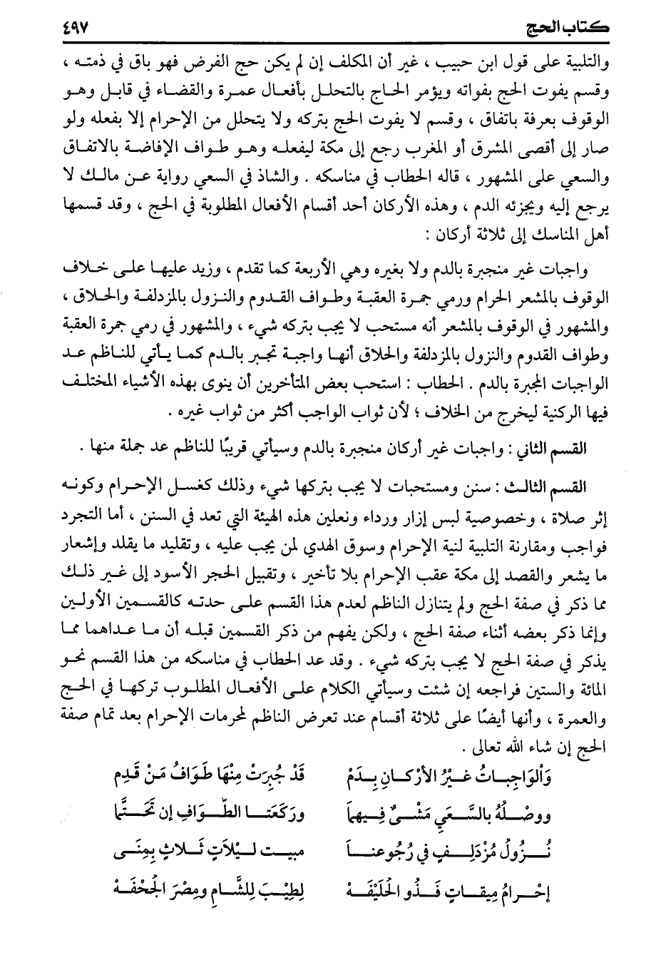 القسم الثاني واجبات غير أركان منجبرة بالدم وسيأتي قريبا للناظم عد جملة منها القسم الثالث سنن ومستحبات لا يجب بتركها شيء وذلك كغسل الإحرام وكونه اثر صلاة وخصوصية لبس إزار ورداء ونعلين هذه الهيئة التي تعد في السنن أما التجرد فواجب ومقارنة التلبية لنية الإحرام وسوق الهدي لمن يجب عليه وتقليد ما يقلد وإشعار ما يشعر والقصد إلى مكة عقب الاحرام بلا تأخير وتقبيل الحجر الأسود الى غير ذلك مما ذكر في صفة الحج ولم يتنازل الناظم لعدم هذا القسم على حدته كالقسمين الأولين وإنما ذكر بعضه أثناء صفة الحج ولكن يفهم من ذكر القسمين قبله أن ما عداهما مما يذكر في صفة الحج لا يجب بتركه شيء وقد عد الحطاب في مناسكه من هذا القسم نحو المائة والستين فراجعه ان شئت وسيأتي الكلام على الأفعال المطلوب تركها في الحج والعمرة وأنها أيضا على ثلاثة أقسام عند تعرض الناظم لمحرمات الإحرام بعد تمام صفة الحج ان شاء اللهتعالى