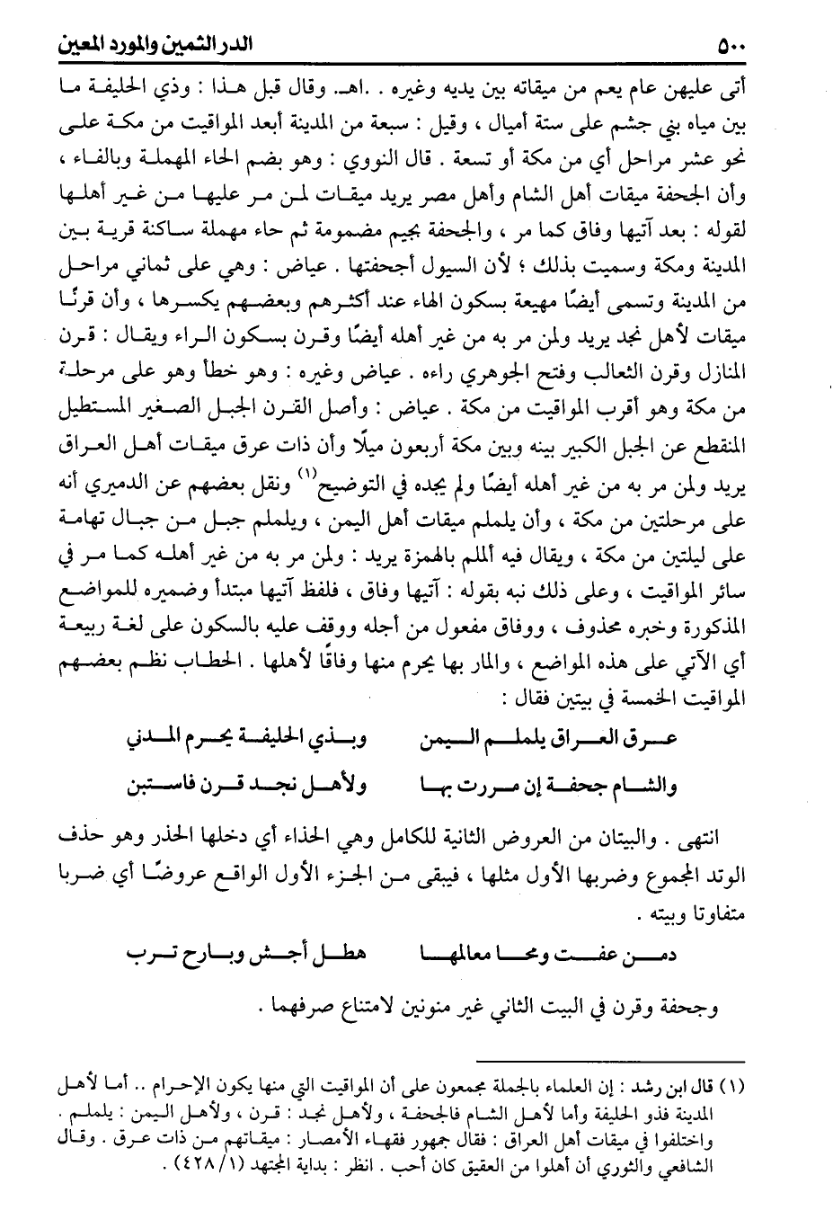 أتى عليهن عام يعم من ميقاته بين يديه وغيره اهـ وقال قبل هذا وذي الحليفة ما بين مياه بني جشم على ستة أميال وقيل سبعة من المدينة أبعد المواقيت من مكة على نحو عشر مراحل أي من مكة أو تسعة قال النووي وهو بضم الحاء المهملة وبالفاء وأن الجحفة ميقات أهل الشام وأهل مصر يريد ميقات لمن مر عليها من غير أهلها لقوله بعد آتيها وفاق كما مر والجحفة بجيم مضمومة ثم حاء مهملة ساكنة قرية بين المدينة ومكة وسميت بذلك لأن السيول أجحفتها عياض وهي على ثماني مراحل من المدينة وتسمى أيضا مهيعة بسكون الهاء عند أكثرهم وبعضهم يكسرها وأن قرنا ميقات لأهل نجد يريد ولمن مر به من غير أهله أيضاً وقرن بسكون الراء ويقال قرن المنازل وقرن الثعالب وفتح الجوهري راءه عياض وغيره وهو خطأ وهو على مرحلة من مكة وهو أقرب المواقيت من مكة عياض وأصل القرن الجبل الصغير المستطيل المنقطع عن الجبل الكبير بينه وبين مكة أربعون ميلا وأن ذات عرق ميقات أهل العراق يريد ولمن مر به من غير أهله أيضا ولم يجده في التوضيح ونقل بعضهم عن الدميري أنه على مرحلتين من مكة وأن يلملما ميقات أهل اليمن ويلملم جبل من جبال تهامة على ليلتين من مكة ويقال فيه ألملم بالهمزة يريد ولمن مر به من غير أهله كما مر في سائر المواقيت وعلى ذلك نبه بقوله آتيها وفاق فلفظ آتيها مبتدأ وضميره للمواضع المذكورة وخبره محذوف ووفاق مفعول من أجله ووقف عليه بالسكون على لغة ربيعة أي الأتي على هذه المواضع والمار بها يحرم منها وفاقا لأهلها الحطاب نظم بعضهم المواقيت الخمسة في بيتين فقال
