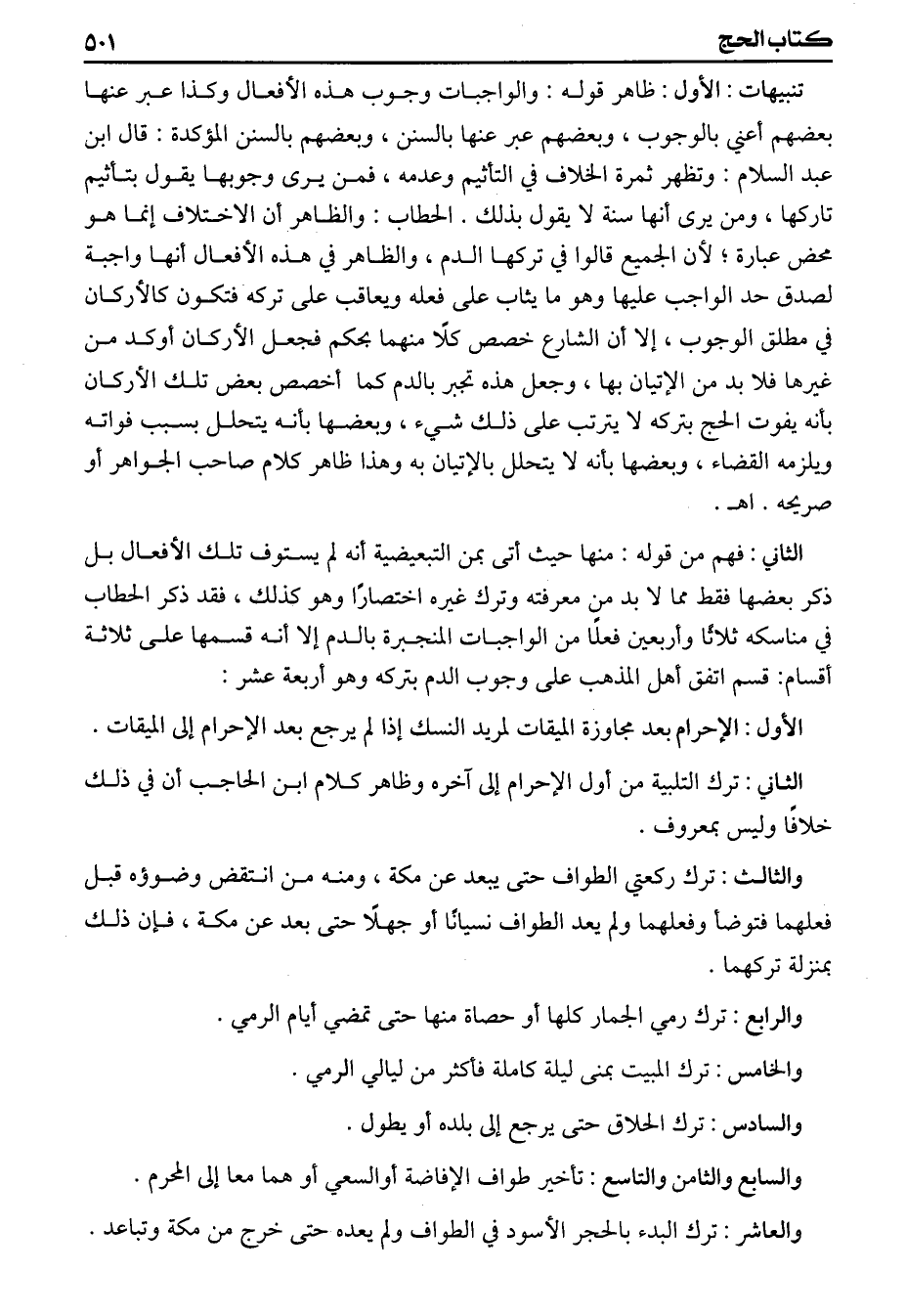 (تنبيهات) الأول ظاهر قوله والواجبات وجوب هذه الأفعال وكذا عبر عنها بعضهم أعني بالوجوب وبعضهم عبر عنها بالسنن وبعضهم بالسنن المؤكدة قال ابن عبد السلاموتظهر ثمرة الخلاف في في التأثيم وعدمه فمن يرى وجوبها يقول بتأثيم تاركها ومن يرى أنها سنة لا يقول بذلك الحطاب، والظاهر أن الاختلاف إنما هو محض عبارة لأن الجميع قالوا في تركها الدم والظاهر في هذه الأفعال أنها واجبة لصدق حد الواجب عليها وهو ما يثاب على فعله ويعاقب على تركه فتكون كالأركان في مطلق الوجوب إلا أن الشارع خصص كلا منهما بحكم فجعل الأركان أوكد من غيرها فلا بد من الإتيان بها وجعل هذه تجبر بالدم كما لم أخصص بعض تلك الاركان بأنه يفوت الحج بتركه لا يترتب على ذلك شيء وبعضها بأنه يتحلل بسبب فواته ويلزمه القضاء وبعضها بأنه لا يتحلل بالإتيان به وهذا ظاهر كلام صاحب الجواهر أو صريحه اهـ الثاني فهم من قوله منها حيث أتى بمن التبعيضية أنه لم يستوف تلك الأفعال بل ذكر بعضها فقط مما لا بد من معرفته وترك غيره اختصاراً وهو كذلك فقد ذكر الحطاب في مناسكه ثلاثا وأربعين فعلا من الواجبات المنجبرة بالدم إلا أنه قسمها على ثلاثة أقسام: قسم اتفق أهل المذهب على وجوب الدم بتركه وهو أربعة عشر الأول الإحرام بعد مجاوزة الميقات لمريد النسك إذا لم يرجع بعد الإحرام الى الميقات والثاني ترك التلبية من أول الإحرام الى آخره وظاهر كلام ابن الحاجب أن في ذلك خلافا وليس بمعروف والثالث ترك ركعتي الطواف حتى يبعد عن مكة ومنه من انتقض وضوؤه قبل فعلهما فتوضأ وفعلهما ولم يعد الطواف نسيانا أو جهلاً حتى بعد عن مكة فإن ذلك بمنزلة تركهما والرابع ترك رمي الجمار كلها أو حصاة منها حتى تمضي أيام الرمي والخامس ترك المبيت بمعنى ليلة كاملة فأكثر من ليالي الرمي والسادس ترك الحلاق حتى يرجع الى بلده أو يطول والسابع والثامن والتاسع تأخير طواف الإفاضة أوالسعي أو هما معا الى المحرم