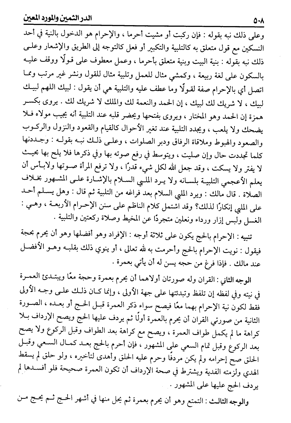 (تنبيه) الاحرام بالحج يكون على ثلاثة أوجه الافراد وهو أفضلها وهو أن يحرم بحجة فيقول نويت الاحرام بالحج وأحرمت به لله تعالى أو ينوي ذلك بقلبه وهو الأفضل عند مالك فإذا فرغ من حجه يسن له أن يأتي بعمرة