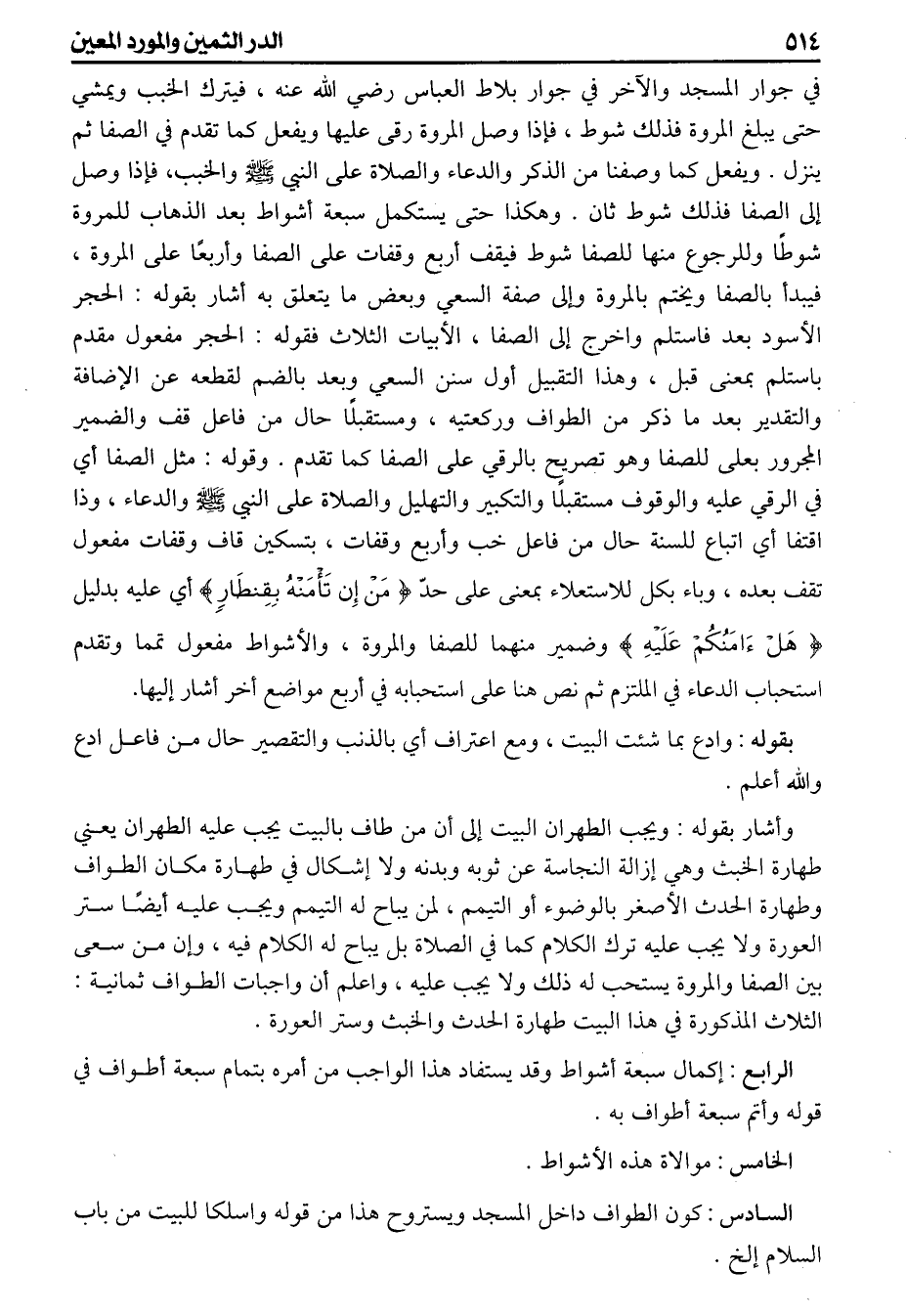 وقفات على الصفا وأربعا على المروة فيبدأ بالصفا ويختم بالمروة وإلى صفة السعي وبعض ما يتعلق به أشار بقوله (الحجر الأسود بعد فاستلم واخرج إلى الصفا) الأبيات الثلاث فقوله الحجر مفعول مقدم باستلم بمعنى قبل وهذا التقبيل أول سنن السعي وبعد بالضم لقطعه عن الإضافة والتقدير بعد ما ذكر من الطواف وركعتيه ومستقبلا حال من فاعل قف والضمير المجرور بعلى للصفا وهو تصريح بالرقي على الصفا كما تقدم وقوله مثل الصفا أي في الرقي عليه والوقوف مستقبلا والتكبير والتهليل والصلاة على النبي صلى الله عليه وسلم والدعاء (وذا اقتفا) أي اتباع للسنة حال من فاعل خب وأربع وقفات بتسكين قاف وقفات مفعول تقف بعده وباء بكل للاستعلاء بمعنى على أحد (من أن تأمنه بقنطار) أي عليه بدليل (هل آمنكم عليه) وضمير منهما للصفا والمروة والأشواط مفعول (تمما) وتقدم استحباب الدعاء في الملتزم ثم نص هنا على استحبابه في أربع مواضع أخر أشار اليها بقوله (وادع بما شئت) البيت ومع اعتراف أي بالذنب والتقصير حال من فاعل ادع والله أعلم وأشار بقوله (ويجب الطهران) البيت إلى أن من طاف بالبيت يجب عليه الطهران يعني طهارة الخبث وهي إزالة النجاسة عن ثوبه وبدنه ولا إشكال في طهارة مكان الطواف وطهارة الحدث الأصغر بالوضوء أو التيمم لمن يباح له التيمم ويجب عليه أيضا ستر العورة ولا يجب عليه ترك الكلام كما في الصلاة بل يباح له الكلام فيه وإن من سعى بين الصفا والمروة يستحب له ذلك ولا يجب عليه
