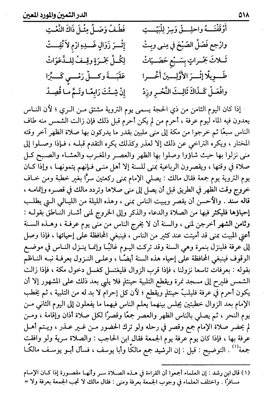 إذا كان اليوم الثامن من ذي الحجة يسمى يوم التروية مشتق من الري لأن الناس يعدون فيه الماء ليوم عرفة أحرم من لم يكن أحرم قبل ذلك فإن زمت الشمس منه طاف الناس سبعا ثم خرجوا من مكة الى منى ملبين بقدر ما يدركون بها صلاة الظهر آخر وقته المختار ويكره التراخي عن ذلك إلا لعذر وكذلك يكره التقدم قبله فإذا وصلوا الى منى نزلوا بها حيث شاؤوا وصلو بها الظهر والعصر والمغرب والعشاء والصبح كل صلاة في وقتها ويقصرون الرباعية بمنى للسنة إلا أهل منى فإنهم يتمونها وإذا كان يوم التروية يوم جمعة فقال مالك يصلي الإمام بمنى ركعتين سرا بغير خطبة ومن خاف خروج وقت الظهر في الطريق قبل أن يصل الى منى صلاها وتردد مالك في قصره وإتمامه قاله سند والأحسن أن يقصر ويبيت الناس بمنى وهذه الليلة من الليالي التي يطلب إحياؤها فليكثر فيها من الصلاة والدعاء والذكر وإلى الخروج لمنى أشار الناطق بقوله وثامن الشهر أخرجن لمنى والسنة أن لا يخرج الناس من منى يوم عرفة وهذه السنة أعني المبيت بمنى قد أميتت عند كثير من الناس فينبغي المحافظة على إحيائها فإذا وصل إلى عرفة فلينزل بنمرة وهي السنة وقد تركت اليوم غالبا وإنما ينزل الناس في موضع الوقوف فينبغي المحافظة على إحياء هذه السنة أيضا وعلى النزول بعرفة نبه الناظم بقوله (بعرفات تاسعا نزولنا) فإذا قرب الزوال فليغتسل كغسل دخول مكة فإذا زالت الشمس فليرح إلى مسجد نمرة ويقطع التلبية حينئذ فلا يلبي بعد ذلك على المشهور إلا أن يكون أحرم في عرفة فليلب حينئذ ويقطع لأن كل إحرام لا بد له من التلبية ثم يخطب الإمام بعد الزوال خطبتين يجلس بينهما يعلم الناس فيهما ما يفعلون إلى اليوم الثاني من يوم النحر ثم يصلي بالناس الظهر والعصر جمعا وقصرا لكل صلاة أذان وإقامة ومن لم يحضر صلاة الإمام جمع وقصر في رحله ولو ترك الحضور من غير عذر ويتم أهل عرفة بها فإذا كان يوم عرفة يوم الجمعة فقال ابن الحاجب والصلاة سرية ولو وافقت جمعة التوضيح قيل إن الرشيد جمع مالكا وأبا يوسف فسأل أبو يوسف مالكا
