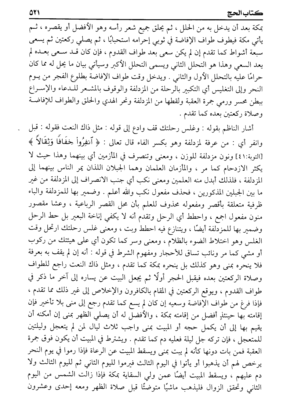 بمكة بعد أن يدخل به من الحلل ثم يحلق جميع شعر رأسه وهو الأفضل أو يقصره ثم يأتي مكة فيطوف طواف الإفاضة في ثوبي إحرامه استحبابا ثم يصلي ركعتين ثم يسعى سبعة أشواط كما تقدم إن لم يكن سعى بعد طواف القدوم فإن كان قد سعى بعده لم يعد السعي وهذا هو التحلل الثاني ويسمى التحلل الأكبر وسيأتي بيان ما يحل له مما كان حراما عليه بالتحلل الأول والثاني ويدخل وقت طواف الإفاضة بطلوع الفجر من يوم النحر وإلى التغليس أي التكبير بالرحلة من المزدلفة والوقوف بالمشعر للدعاء والإسراع ببطن محسر ورمي جمرة العقبة ولقطها من المزدلفة ونحر الهدي والحلق والطواف للإفاضة وصلاة ركعتين بعده كما تقدم أشار الناظم بقوله (وغلس رحلتك قف وادع) إلى قوله (مثل ذاك النعت) فقوله قبل (وانفر) أي من عرفة لمزدلفة وهو بكسر الفاء قال تعالى {وانفروا خفافا وثقالا} ونون مزدلفة للوزن ومعنى وتنصرف في المأزمين أي بينهما وهذا حيث لا يكثر الازدحام كما مر والمأزمان العلمان وهما الجبلان اللذان يمر الناس بينهما إلى المزدلفة فلذلك أبدل منه العلمين ومعنى نكب أي جنب الانصراف إلى المزدلفة من غير ما بين الجبلين المذكورين فحذف مفعول نكب والله أعلم وضمير بها للمزدلفة والباء ظرفية متعلقة باقصر ومفعوله محذوف للعلم بأن محل القصر الرباعية وعشا مقصور منون مفعول اجمع واحطط أي الرحل وتقدم أنه لا يكفي إناخة البعير بل حط الرحل وضمير بها للمزدلفة أيضا وينازع فيه احطط وبت ومعنى غلس رحلتك ارتحل وقت الغلس وهو اختلاط الضوء بالظلام ومعنى سر كما تكون أي على هيئتك من ركوب أو مشي كما مر ونائب تساق للاحجار ومفهوم الشرط في قوله أنه إن لم يقف به بعرفة فلا ينحره بمنى وهو كذلك بل ينحره بمكة كما تقدم ومثل ذاك النعت راجع للطواف وصلاة الركعتين بعده فيقبل الحجر أولا ثم يجعل البيت عن يساره إلى آخر ما ذكر في طواف القدوم ويوقع الركعتين في المقام بالكافرون والإخلاص إلى غير ذلك مما تقدم فإذا فرغ من طواف الإفاضة وسعيه إن كان لم يسع كما تقدم رجع الى منى بلا تأخير فإن إقامته بها حينئذ أفضل من إقامته بمكة والأفضل له أن يصلي الظهر بمنى إن أمكنه أن يقيم بها إلى أن يكمل حجه أو المبيت بمنى واجب ثلاث ليال لمن لم يتعجل وليلتين للمتعجل فإن تركه جل ليلة فعليه دم كما تقدم ويشترط في المبيت أن يكون فوق جمرة القبة فمن بات دونها كأنه لم يبت بمنى ويسقط المبيت عن الرعاة فإذا رموا في يوم النحر يرخص لهم أن يذهبوا أو يأتوا في اليوم الثالث فيرموا لليوم الثاني ثم لليوم الثالث ولا دم عليهم ويسقط المبيت أيضا عمن ولي السقاية بمكة فإذا زالت الشمس من اليوم الثاني وتحقق الزوال فليذهب ماشيا متوضئا قبل صلاة الظهر ومعه إحدى وعشرون