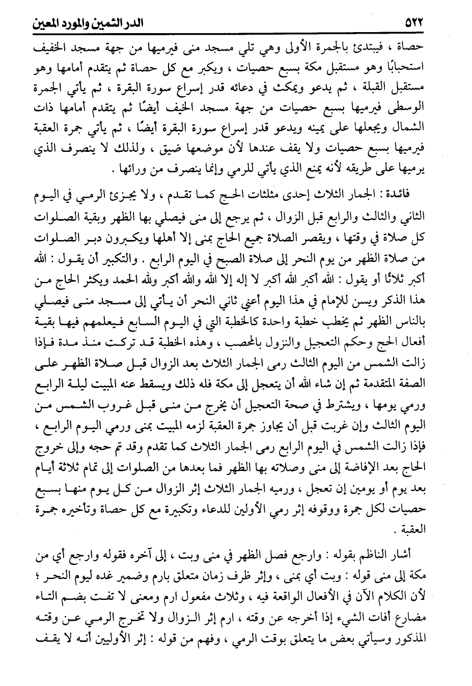 حصاة فيبتديء بالجمرة الأولى وهي تلي مسجد منى فيرميها من جهة مسجد الخفيف استحبابا وهو مستقبل مكة بسبع حصيات ويكبر مع كل حصاة ثم يتقدم أمامها وهو مستقبل القبلة ثم يدعو ويمكث في دعائه قدر إسراع سورة البقرة ثم يأتي الجمرة الوسطى فيرميها بسبع حصيات من جهة مسجد الخفيف أيضا ثم يتقدم أمامها ذات الشمال ويجعلها على يمينه ويدعو قدر إسراع سورة البقرة أيضا ثم يأتي جمرة العقبة فيرميها بسبع حصيات ولا يقف عندها لأن موضعها ضيق ولذلك لا ينصرف الذي يرميها على طريقه لأنه يمنع الذي يأتي للرمي وإنما ينصرف من ورائها (فائدة) الجمار الثلاث إحدى مثلثات الحج كما تقدم ولا يجزيء الرمي في اليوم الثاني والثالث والرابع قبل الزوال ثم يرجع الى منى فيصلي بها الظهر وبقية الصلوات كل صلاة في وقتها ويقصر الصلاة جميع الحاج بمنى إلا أهلها ويكبرون دبر الصلوات من صلاة الظهر من يوم النحر إلى صلاة الصبح في اليوم الرابع والتكبير أن يقول الله أكبر ثلاثا أو يقول الله أكبر الله أكبر لا إله الا الله والله أكبر ولله الحمد ويكثر الحاج من هذا الذكر ويسن للإمام في هذا اليوم أعني ثاني النحر أن يأتي إلى مسجد منى فيصلي بالناس الظهر ثم يخطب خطبة واحدة كالخطبة التي في اليوم السابع فيعلمهم فيها بقية أفعال الحج وحكم التعجيل والنزول بالمحصب وهذه الخطبة قد تركت منذ مدة فإذا زالت الشمس من اليوم الثالث رمى الجمار الثلاث بعد الزوال قبل صلاة الظهر على الصفة المتقدمة ثم إن شاء الله أن يتعجل إلى مكة فله ذلك ويسقط عنه المبيت ليلة الرابع ورمي يومها ويشترط في صحة التعجيل أن يخرج من منى قبل غروب الشمس من اليوم الثالث وإن غربت قبل أن يجاوز جمرة العقبة لزمه المبيت بمنى ورمي اليوم الرابع فإذا زالت الشمس في اليوم الرابع رمى الجمار الثلاث كما تقدم وقد تم حجه وإلى خروج الحاج بعد الإفاضة إلى منى وصلاته بها الظهر فما بعدها من الصلوات إلى تمام ثلاثة أيام بعد يوم أو يومين إن تعجل ورميه الجمار الثلاث أثر الزوال من كل يوم منها بسبع حصيات لكل جمرة ووقوفه إثر رمي الأولين للدعاء وتكبيرة مع كل حصاة وتأخيره جمرة العقبة أشار الناظم بقوله (وارجع فصل الظهر في منى وبت) إلى آخره فقوله وارجع أي من مكة إلى منى قوله وبت أي بمنى وإثر ظرف زمان متعلق بارم وضمير غده ليوم النحر لأن الكلام الآن في الأفعال الواقعة فيه وثلاث مفعول ارم ومعنى لا تفت بضم التاء مضارع أفات الشيء إذا أخرجه عن وقته أرم إثر الزوال ولا تخرج الرمي عن وقته المذكور وسيأتي بعض ما يتعلق بوقت الرمي وفهم من قوله إثر الأولين أنه لا يقف