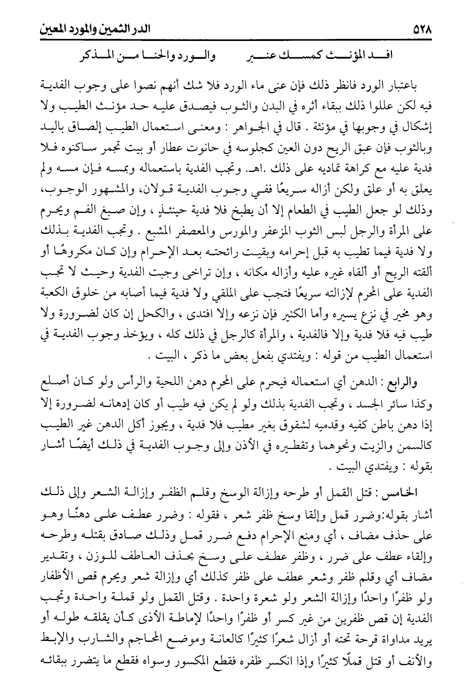 باعتبار الورد فانظر ذلك فان عنى ماء الورد فلا شك أنهم نصوا على وجوب الفدية فيه لكن عللوا ذلك ببقاء أثره في البدن والثوب فيصدق عليه حد مؤنث الطيب ولا شكال في وجوبها في مؤنثة قال في الجواهر ومعنى استعمال الطيب إلصاق باليد وبالثوب فإن عبق الريح دون العين كجلوسه في حانوت عطار أو بيت تجمر ساكنوه فلا فدية عليه مع كراهة تماديه على ذلك اهـ وتجب الفدية باستعماله وبمسه فإن مسه ولم يعلق به أو علق ولكن أزاله سريعا ففي وجوب الفدية قولان، والمشهور الوجوب، وذلك لو جعل الطيب في الطعام إلا أن يطبخ فلا فدية حينئذ وإن صبغ الفم ويحرم على المرأة والرجل لبس الثوب المزعفر والمورس والمعصفر المشبع وتجب الفدية بذلك ولا فدية فيما تطيب به قبل إحرامه وبقيت رائحته بعد الإحرام وإن كان مكروها أو ألقته الريح أو ألقاه غيره عليه وأزاله مكانه وإن تراخى وجبت الفدية وحيث لا تجب الفدية على المحرم لإزالته سريعا فتجب على الملقي ولا فدية فيما أصابه من خلوق الكعبة وهو مخير في نزع يسيره وأما الكثير فإن نزعه وإلا افتدى والكحل إن كان لضرورة ولا طيب فيه فلا فدية وإلا فالفدية والمرأة كالرجل في ذلك كله ويؤخر وجوب الفدية في استعمال الطيب من قوله (ويفتدي بفعل بعض ما ذكر) البيت، والرابع الدهن أي استعماله فيحرم على المحرم دهن اللحية والرأس ولو كان أصلع وكذا سائر الجسد وتجب الفدية بذلك ولو لم يكن فيه طيب أو كان ادهانه لضرورة إلا إذا دهن باطن كفيه وقدميه لشقوق بغير مطيب فلا فدية ويجوز أكل الدهن غير الطيب كالسمن والزيت ونحوهما وتقطيره في الأذن وإلى وجوب الفدية في ذلك أيضاً أشار بقوله (ويفتدي) البيت، الخامس قتل القمل أو طرحه وإزالة الوسخ وقلم الظفر وإزالة الشعر وإلى ذلك أشار بقوله (وضرر قمل وإلقا وسخ ظفر شعر) فقوله وضرر عطف على دهنا وهو على حذف مضاف أي ومنع الإحرام دفع ضرر قمل وذلك صادق بقتله وطرحه وإلقاء عطف على ضرر وظفر عطف على وسخ بحذف العاطف للوزن وتقدير مضاف أي وقلم ظفر وشعر عطف على ظفر كذلك أي وإزالة شعر ويحرم قص الأظفار ولو ظفرا واحدا وإزالة الشعر ولو شعرة واحدة وقتل القمل ولو قملة واحدة وتجب الفدية إن قص ظفرين من غير كسر أو ظفراً واحداً لإماطة الأذى كأن يقلقه طوله أو يريد مداواة قرحة تحته أو أزال شعراً كثيراً كالعانة وموضع المحاجم والشارب والإبط والأنف أو قتل قملا كثيرا وإذا انكسر ظفره فقطع المكسور وسواه فقطع ما يتضرر ببقائه