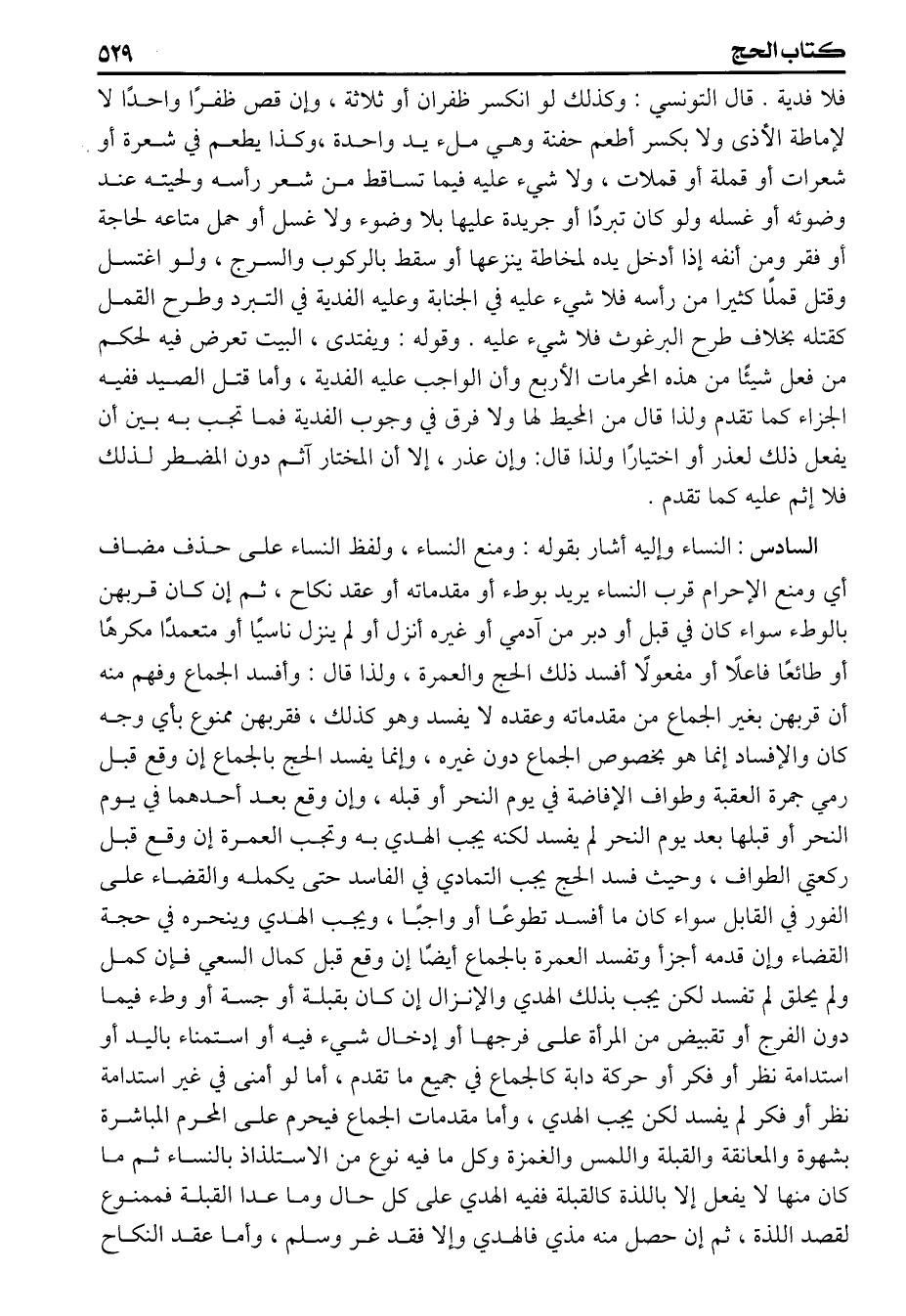 فلا فدية قال التونسي وكذلك لو انكسر ظفران أو ثلاثة وان قص ظفرا واحدا لا لإماطة الأذى ولا بكسر أطعم حفنة وهي ملء يد واحدة وكذا يطعم في شعرة أو شعرات أو قملة أو قملات ولا شيء عليه فيما تساقط من شعر رأسه ولحيته عند وضوئه أو غسله ولو كان تبردا أو جريدة عليها بلا وضوء ولا غسل أو حمل متاعه الحاجة أو فقر ومن أنفه إذا أدخل يده لمخاطة ينزعها أو أسقط بالركوب والسرج ولو اغتسل وقتل قملا كثيرا من رأسه فلا شيء عليه في الجنابة وعليه الفدية في التبرد وطرح القمل كقتله بخلاف طرح البرغوث فلا شيء عليه وقوله (ويفتدى) البيت تعرض فيه لحكم من فعل شيئاً من هذه المحرمات الأربع وأن الواجب عليه الفدية وأما قتل الصيد ففيه الجزاء كما تقدم ولذا قال من المحيط لهنا ولا فرق في وجوب الفدية فيما تجب بين أن يفعل ذلك لعذر أو اختيارا ولذا قال (وإن عذر) إلا أن المختار آثم دون المضطر لذلك فلا إثم عليه كما تقدم، السادس النساء وإليه أشار بقوله ومنع النساء ولفظ النساء على حذف مضاف أي ومنع الإحرام قرب النساء يريد بوطء أو مقدماته أو عقد نكاح ثم إن كان قربهن بالوطء سواء كان في قبل أو دبر من آدمي أو غيره أنزل أو لم ينزل ناسياً أو متعمدا مكرها أو طائعا فاعلاً أو مفعولا أفسد ذلك الحج والعمرة ولذا قال وأفسد الجماع وفهم منه أن قربهن بغير الجماع من مقدماته وعقده لا يفسد وهو كذلك فقربهن ممنوع بأي وجه كان والافساد إنما هو بخصوص الجماع دون غيره وإنما يفسد الحج بالجماع إن وقع قبل رمي جمرة العقبة وطواف الإفاضة في يوم النحر أو قبله وإن وقع بعد أحدهما في يوم النحر أو قبلها بعد يوم النحر لم يفسد لكنه يجب الهدي به وتجب العمرة إن وقع قبل ركعتي الطواف وحيث فسد الحج يجب التمادي في الفاسد حتى يكمله والقضاء على الفور في القابل سواء كان ما أفسد تطوعا أو واجبا ويجب الهدي وينحره في حجة القضاء وإن قدمه أجزأ وتفسد العمرة بالجماع أيضا إن وقع قبل كمال السعي فإن كمل ولم يحلق لم تفسد لكن يجب بذلك الهدي والانزال إن كان بقبلة أوجسة أو وطء فيما دون الفرج أو تقبيض من المرأة على فرجها أو إدخال شيء فيه أو استمناء باليد أو استدامة نظر أو فكر أو حركة دابة كالجماع في جميع ما تقدم أما لو أمنى في غير استدامة نظر أو فكر لم يفسد لكن يجب الهدي وأما مقدمات الجماع فيحرم على المحرم المباشرة بشهوة والمعانقة والقبلة واللمس والغمزة وكل ما فيه نوع من الاستلذاذ بالنساء ثم ما كان منها لا يفعل إلا باللذة كالقبلة ففيه الهدي على كل حال وما عدا القبلة فممنوع لقصد اللذة ثم إن حصل منه مذي فالهدي وإلا فقد غر وسلم وأما عقد النكاح