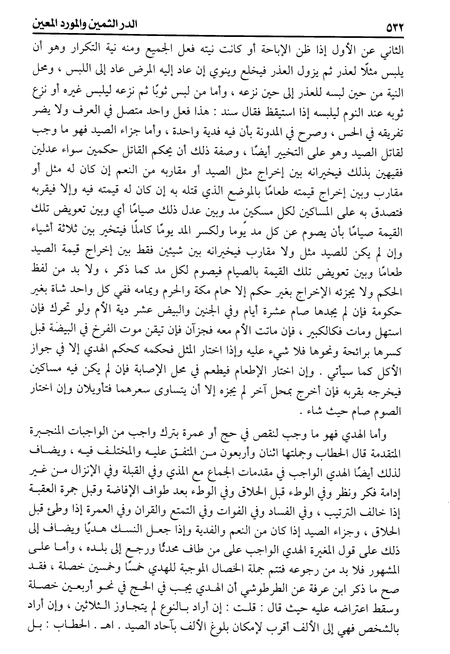 الثاني عن الأول إذا ظن الإباحة أو كانت نيته فعل الجميع ومنه نية التكرار وهو أن يلبس مثلا لعذر ثم يزول العذر فيخلع وينوي إن عاد إليه المرض عاد إلى اللبس ومحل النية من حين لبسه للعذر إلى حين نزعه وأما من لبس ثوبا ثم نزعه ليلبس غيره أو نزع ثوبه عند النوم ليلبسه إذا استيقظ فقال سند هذا فعل واحد متصل في العرف ولا يضر تفريقه في الحس وصرح في المدونة بأن فيه فدية واحدة وأما جزاء الصيد فهو ما وجب لقاتل الصيد وهو على التخيير أيضا وصفة ذلك أن يحكم القاتل حكمين سواء عدلين فقيهين بذلك فيخيرانه بين إخراج مثل الصيد أو مقاربه من النعم إن كان له مثل أو مقارب وبين إخراج قيمته طعاما بالموضع الذي قتله به إن كان له قيمته فيه وإلا فيقربه فتصدق به على المساكين لكل مسكين مد وبين عدل ذلك صياما أي وبين تعويض تلك القيمة صياما بأن يصوم عن كل مد يوما ولكسر المد يوما كاملا فيتخير بين ثلاثة أشياء وإن لم يكن للصيد مثل ولا مقارب فيخيرانه بين شيئين فقط بين إخراج قيمة الصيد طعاما وبين تعويض تلك القيمة بالصيام فيصوم لكل مد كما ذكر ولا بد من لفظ الحكم ولا يجزئه الاخراج بغير حكم الا حمام مكة والحرم ويمامه ففي كل واحد شاة بغير حكومة فإن لم يجدها صام عشرة أيام وفي الجنين والبيض عشر دية اوم ولو تحرك فان استهل ومات فكالكبير فإن ماتت الأم معه فجزاءان فإن تيقن موت الفرخ في البيضة قبل كسرها برائحة ونحوها فلا شيء عليه وإذا اختار المثل فحكمه كحكم الهدي إلا في جواز الأكل كما سيأتي وإن اختار الإطعام فيطعم في محل الإصابة فإن لم يكن فيه مساكين فيخرجه بقربه فإن أخرج بمحل آخر لم يجزه إلا أن يتساوى سعرهما فتأولان وإن اختار الصوم صام حيث شاء