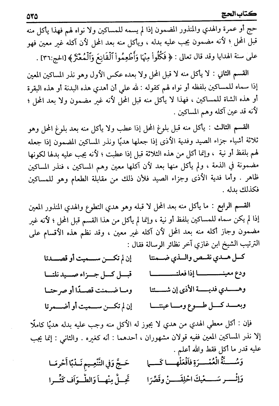 حج أو عمرة والهدي والمنذور المضمون إذا يسمه للمساكين ولا نواه لهم فهذا يأكل منه قبل المحل لأنه مضمون يجب عليه بدله ويأكل منه بعد المحل لأن أكله غير معين فهو على سنة الهدايا وقد قال تعالى {فكلوا منها وأطعموا القانع والمعتر} القسم الثاني لا يأكل منه لا قبل المحل ولا بعده عكس الأول وهو نذر المساكين المعين إذا سماه للمساكين بلفظه أو نواه لهم كقوله لله علي أن أهدي هذه البدنة أو هذه البقرة أو هذه الشاة للمساكين فهذا لا يأكل منه قبل المحل لأنه غير مضمون ولا بعد المحل لأنه قد عين آكله وهم المساكين القسم الثالث يأكل منه قبل بلوغ المحل إذا عطب ولا يأكل منه بعد بلوغ المحل وهو ثلاثة أشياء جزاء الصيد وفدية الأذى إذا جعلها هديا ونذر المساكين المضمون إذا جعله لهم بلفظ أو نية وإنما أكل من هذه الثلاثة قبل إذا عطبت لأنه يجب عليه بدلها لكونها مضمونة في الذمة ولم يأكل منها بعد لأن آكلها معين وهم المساكين فنذر المساكين ظاهر وأما فدية الأذى وجزاء الصيد فلأن ذلك من مقابلة الطعام وهو للمساكين فكذلك بدله القسم الرابع ما يأكل منه