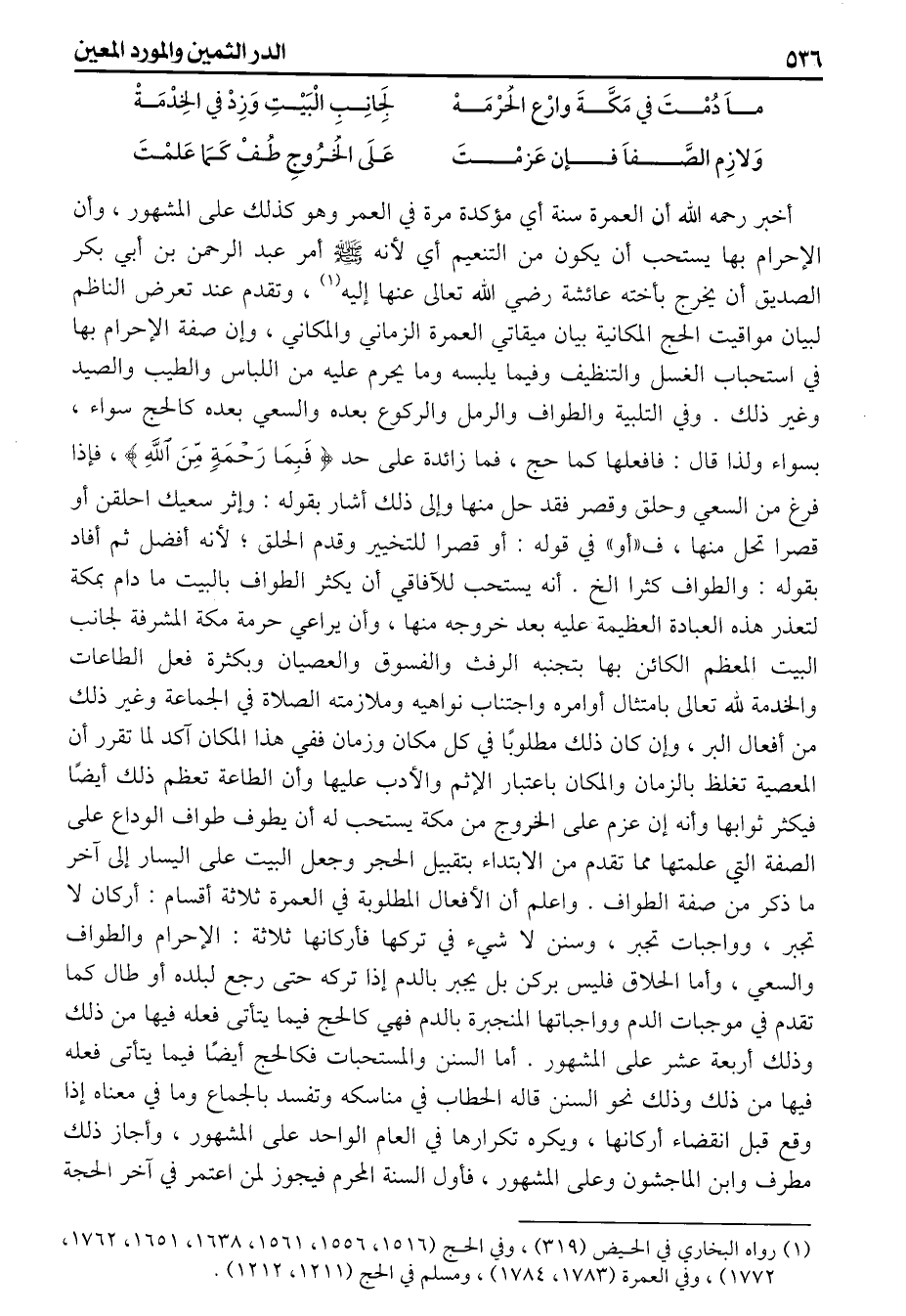 عَلَى الخُرُوجِ طُفْ كَمَا عَلمْتَ أخبر رحمه الله أن العمرة سنة أي مؤكدة مرة في العمر وهو كذلك على المشهور وأن الاحرام بها يستحب أن يكون من التنعيم أي لأنه أمر عبد الرحمن بن أبي بكر الصديق أن يخرج بأخته عائشة رضي الله تعالى عنها اليه وتقدم عند تعرض الناظم لبيان مواقيت الحج المكانية بيان ميقاتي العمرة الزماني والمكاني وإن صفة الإحرام بها في استحباب الغسل والتنظيف وفيما يلبسه وما يحرم عليه من اللباس والطيب والصيد وغير ذلك وفي التلبية والطواف والرمل والركوع بعده والسعي بعده كالحج سواء بسواء ولذا قال (فافعلها كما حج) فما زائدة على حد فبما رحمة الله فإذا فرغ من السعي وحلق وقصر فقد حل منها وإلى ذلك أشار بقوله (وإثر سعيك احلقن أو قصرا تحل منها) ف «أو» في قوله أو قصرا للتخييروقدم الحلق لأنه أفضل ثم أفاد بقوله (والطواف كثرا) الخ أنه يستحب للآفاقي أن يكثر الطواف بالبيت ما دام بمكة لتعذر هذه العبادة العظيمة عليه بعد خروجه منها وأن يراعي حرمة مكة المشرفة لجانب البيت المعظم الكائن بها بتجنبه الرفث والفسوق والعصيان وبكثرة فعل الطاعات والخدمة لله تعالى بامتثال أوامره واجتناب نواهيه وملازمته الصلاة في الجماعة وغير ذلك من أفعال البر وإن كان ذلك مطلوبا في كل مكان وزمان ففي هذا المكان آكد لما تقرر أن المعصية تغلظ بالزمان والمكان باعتبار الإثم والأدب عليها وأن الطاعة تعظم ذلك أيضاً فيكثر ثوابها وأنه إن عزم على الخروج من مكة يستحب له أن يطوف طواف الوداع على الصفة التي علمتها مما تقدم من الابتداء بتقبيل الحجر وجعل البيت على اليسار إلى آخر ما ذكر من صفة الطواف