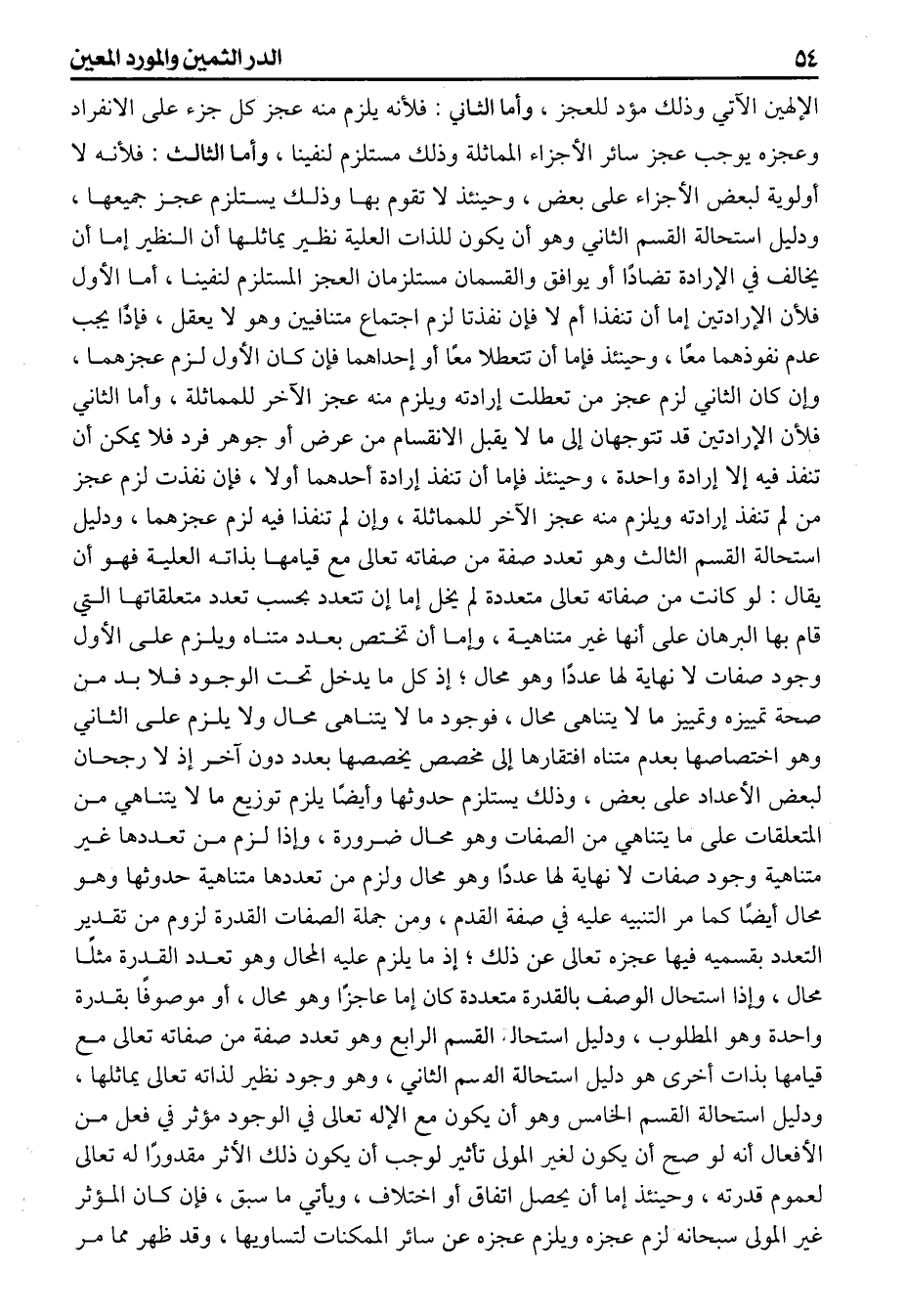 الإلهين الآتي وذلك مؤد للعجز وأما الثاني فلأنه يلزم منه عجز كل جزء على الانفراد وعجزه يوجب عجز سائر الأجزاء المماثلة وذلك مستلزم لنفينا وأما الثالث فلأنه لاأولوية لبعض الأجزاء على بعض وحينئذ لاتقوم بها وذلك يستلزم عجز جميعها ودليل استحالة القسم الثاني وهو أن يكون للذات العلية نظير يماثلها أن النظير إما أن يخالف في الإرادة تضاداً أو يوافق والقسمان مستلزمان العجز المستلزم لنفينا أما الأول فلأن الإرادتين إماأن تنفذا أم لا فإن نفذتا لزم اجتماع متنافيين وهو لايعقل فإذاً يجب عدم نفوذهما معاً وحينئذ فإما أن تتعطلا معاً أو إحداهما فإن كان الأول لزم عجزهماوإن كان الثاني لزم عجز من تعطلت إرادته ويلزم منه عجز الآخر للمماثلة وأما الثاني فلأن الإرادتين قد تتوجهان إلى مالايقبل الانقسام من عرض أوجوهر فرد فلا يمكن أن تنفذفيه إلا إرادة واحدة وحينئذ فإما أن تنفذ إرادة أحدهما أولا فإن نفذت لزم عجز من لم تنفذ إرادته ويلزم منه عجز الآخر للمماثلة وإن لم تنفذا فيه لزم عجزهما ودليل استحالة القسم الثالث وهو تعدد صفة من صفاته تعالى مع قيامها بذاته العلية فهو أن يقال لو كانت من صفاته متعددة لم يخل إما إن تتعدد بحسب تعدد متعلقاتها التي قام بها البرهان على أنها غيرمتناهية وإما أن تختص بعدد متناه ويلزم على الأول وجود صفات لانهاية لها عدداً وهو محال إذ كل مايدخل تحت الوجود فلا بد من صحة تمييزه وتمييز مالا يتناهى محال فوجود مالايتناهى محال ولايلزم على الثاني وهواختصاصها بعدم متناه افتقارها إلى مخصص يخصصها بعد دون آخرإذ لارجحان لبعض الأعداد على بعض وذلك يستلزم حدوثهاوأيضاً يلزم توزيع مالا يتناهي من المتعلقات على مالايتناهي من الصفات وهو محال ضرورة وإذا لزم من تعددها غيرمتناهية وجودصفات لانهاية لها عدداً وهو محال ولزم من تعددها متناهية حدوثها وهو محال أيضاً كما مرالتنبيه عليه في صفة القدم ومن جملة الصفات القدرة لزوم من تقدير التعدد بقسمية فيها عجزه تعالى عن ذلك إذ مايلزم عليه المحال وهو تعدد القدرة مثلاً محال وإذا استحال الوصف بالقدرة متعددة كان إما عاجزاً وهو محال أوموصوفاً بقدرة واحدة وهوالمطلوب ودليل استحالة القسم الرابع وهو تعدد صفة من صفاته تعالى مع قيامها بذات أخرى هو دليل إستحالة القسم الثاني وهو وجود نظير لذاته تعالى يماثلها ودليل استحالة القسم الخامس وهو أن يكون مع الإله تعالى في الوجود مؤثر في فعل من الأفعال أنه لوصح أن يكون لغير المولى تأثير لوجب أن يكون ذلك الأثر مقدوراً له تعالى لعموم قدرته وحينئذ إما أن يحصل اتفاق أواختلاف ويأتي ماسبق فإن كان المؤثر غير المولى سبحانه لزم عجزه ويلزم عجزه عن سائر الممكنات لتساويها وقد ظهر مما مر