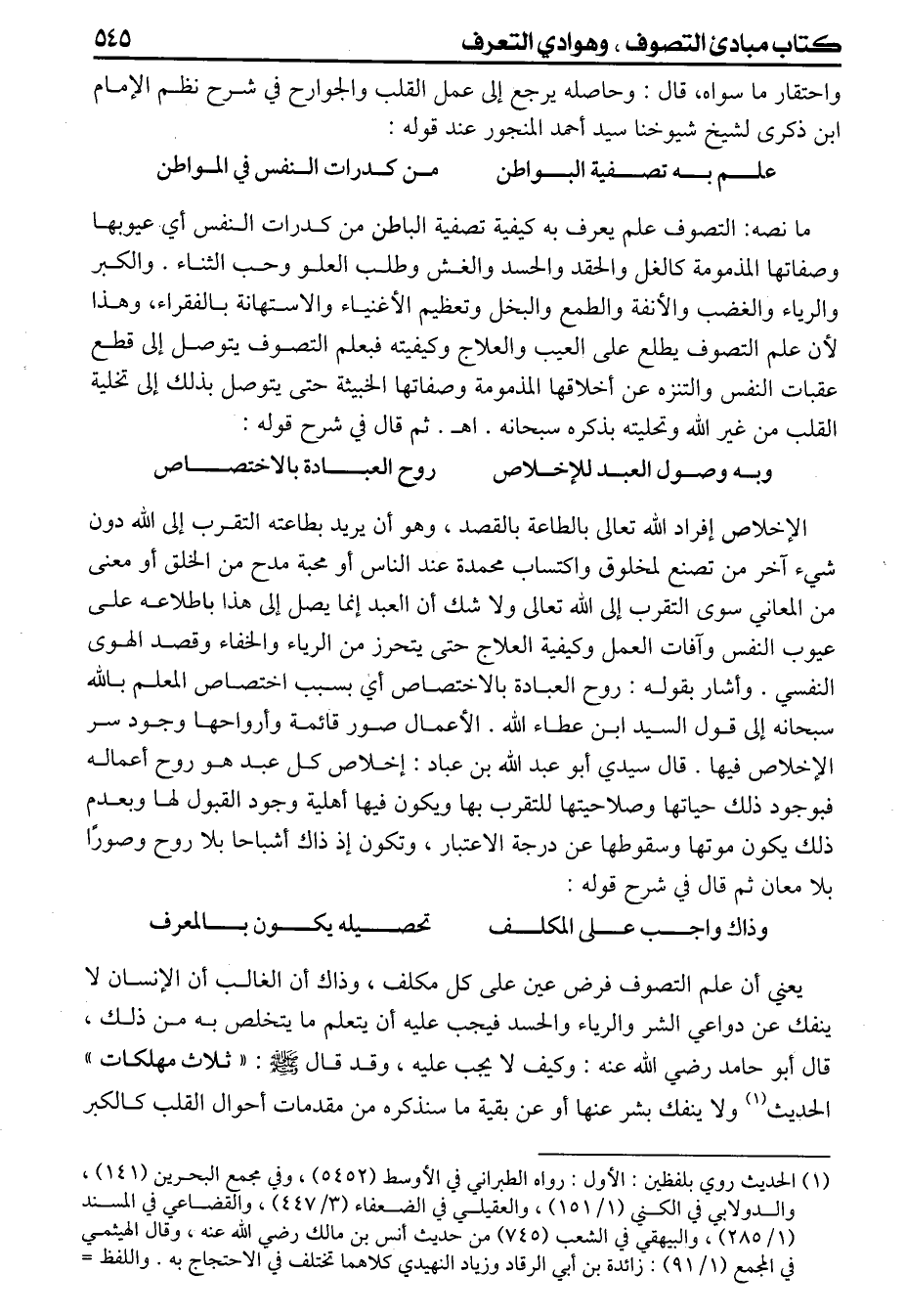 ما نصه: التصوف علم يعرف به كيفية تصفية الباطن من كدورات النفس أي عيوبها وصفاتها المذمومة كالغل والحقد والحسد والغش وطلب العلو وحب الثناء والكبر والرياء والغضب والأنفة والطمع والبخل وتعظيم الأغنياء والاستهانة بالفقراء، وهذا لأن علم التصوف يطلع على العيب والعلاج وكيفيته فبعلم التصوف يتوصل إلى قطع عقبات النفس والتنزه عن أخلاقها المذمومة وصفاتها الخبيثة حتى يتوصل بذلك إلى تخلية القلب من غيرالله وتحليته بذكره سبحانه اهـ ثم قال في شرح قوله