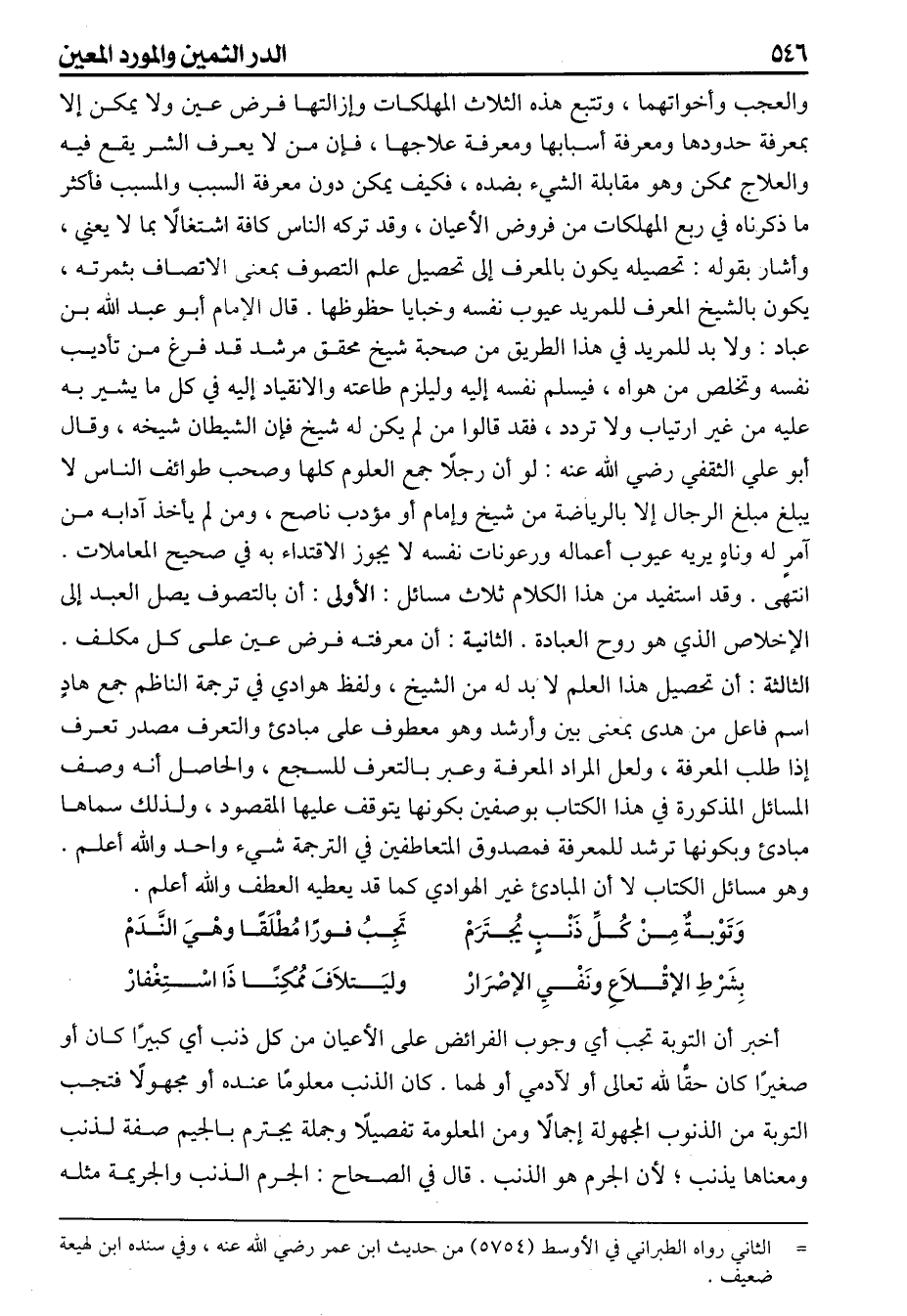 والعجب وأخواتهما وتتبع هذه الثلاث المهلكات وإزالتها فرض عين ولا يمكن إلا بمعرفة حدودها ومعرفة أسبابها ومعرفة علاجها فإن من لا يعرف الشر يقع فيه والعلاج ممكن وهو مقابلة الشيء بضده فكيف يمكن دون معرفة السبب والمسبب فأكثر ما ذكرناه في ربع المهلكات من فروض الأعيان وقد تركه الناس كافة اشتغالا بما لا يعني وأشار بقوله تحصيله يكون بالمعرف إلى تحصيل علم التصوف بمعنى الاتصاف بثمرته يكون بالشيخ المعرف للمريد عيوب نفسه وخبايا حظوظها قال الإمام أبو عبد الله بن عباد ولا بد للمريد في هذا الطريق من صحبة شيخ محقق مرشد قد فرغ من تأديب نفسه وتخلص من هواه فيسلم نفسه إليه وليلزم طاعته والانقياد اليه في كل مايشير به عليه من غير ارتياب ولا تردد فقد قالوا من لم يكن له شيخ فإن الشيطان شيخه وقال أبو علي الثقفي رضي عنه لو أن رجلا جمع العلوم كلها وصحب طوائف الناس لا يبلغ مبلغ الرجال إلا بالرياضة من شيخ وإمام أو مؤدب ناصح ومن لم يأخذ آدابه من آمر له وناه يريه عيوب أعماله ورعونات نفسه لا يجوز الاقتداء به في صحيح المعاملات انتهى