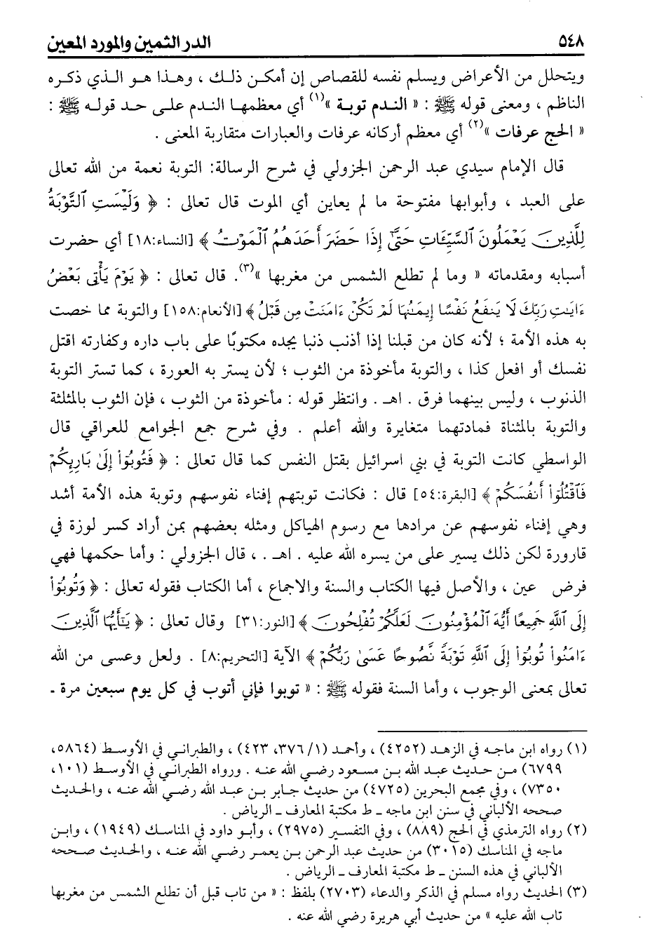 ويتحلل من الاعراض ويسلم نفسه للقصاص إن أمكن ذلك وهذا هو الذي ذكره الناظم ومعنى قوله صلى الله عليه وسلم الندم توبة أي معظمها الندم على حد قوله صلى الله عليه وسلم الحج عرفات أي معظم أركانه عرفات والعبارات متقاربة المعنى قال الإمام سيدي عبد الرحمن الجزولي في شرح الرسالة: التوبة نعمة من الله تعالى على العبد وأبوابها مفتوحة ما لم يعاين أي الموت قال تعالى وليست التوبة للذين يعملون السيئات حتى إذ حضر أحدهم الموت أي حضرت أسبابه ومقدماته وما لم تطلع الشمس من مغربها قال تعالى {يوم يأتي بعض آيات ربك لا ينفع نفسا إيمانها لم تكن آمنت من قبل} والتوبة مما خصت به هذه الأمة لأنه كان من قبلنا إذا أذنب ذنبا يجده مكتوبا على باب داره وكفارته اقتل نفسك أو افعل كذا والتوبة مأخوذة من الثوب لأن يستر به العورة